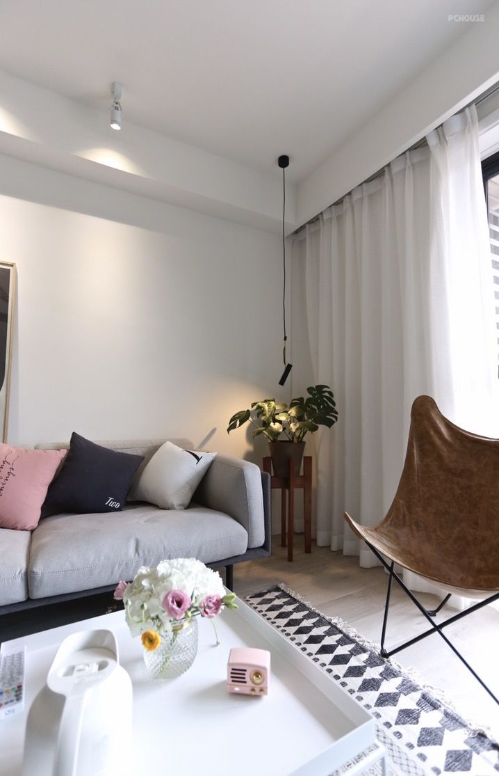 整个客厅没有任何多余的吊顶,使用用了明装的射灯照亮沙发背景。沙发角落加了一盏小吊灯,让角落增加趣味性。