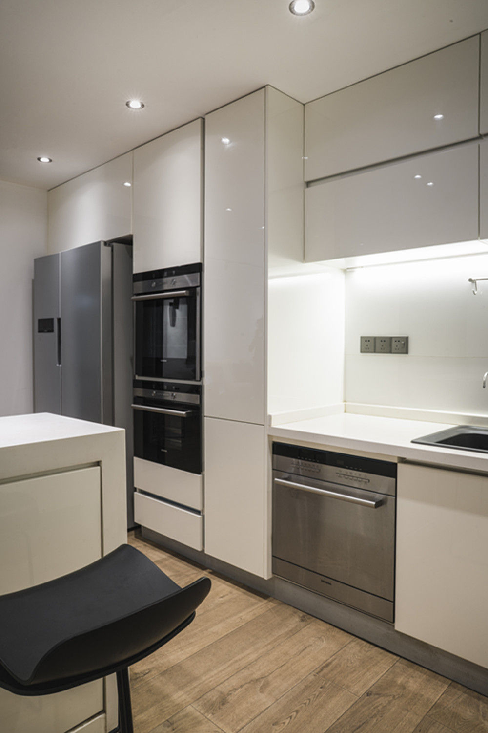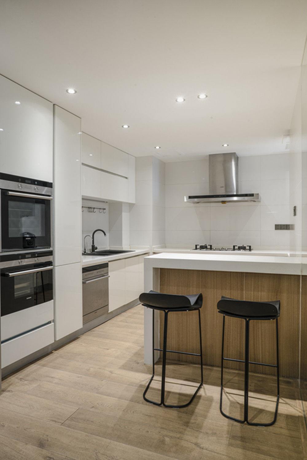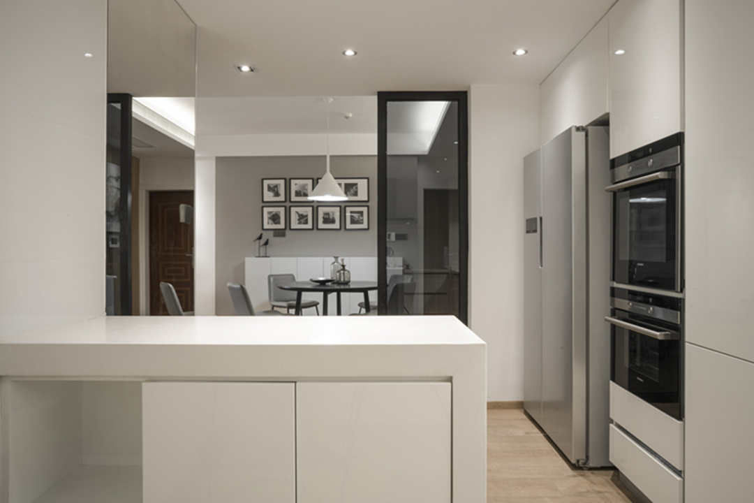 嵌入式的蒸箱和烤箱是个节省空间的好办法,台吧的设计划分餐厅与厨房的空间链接,恰到好处。