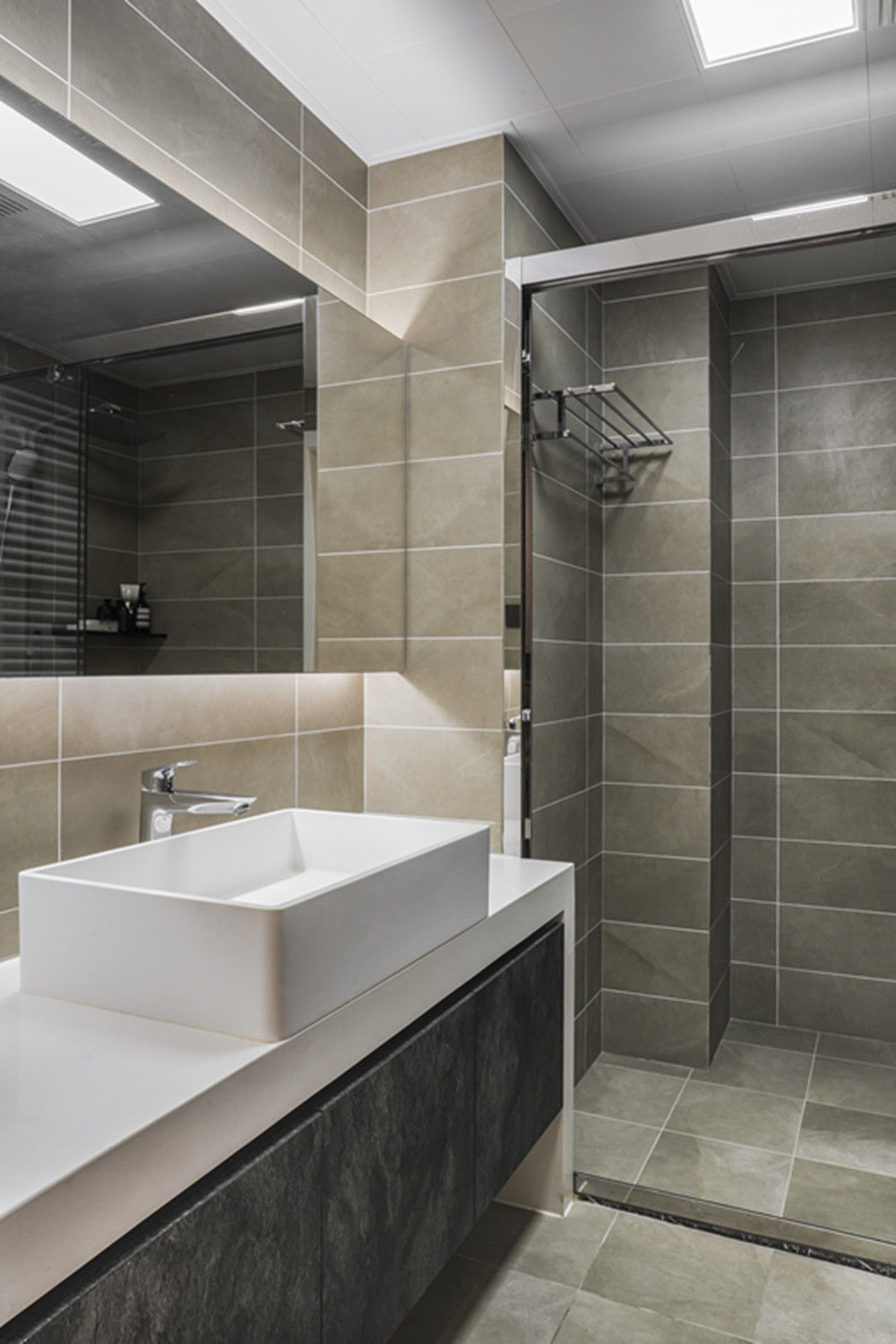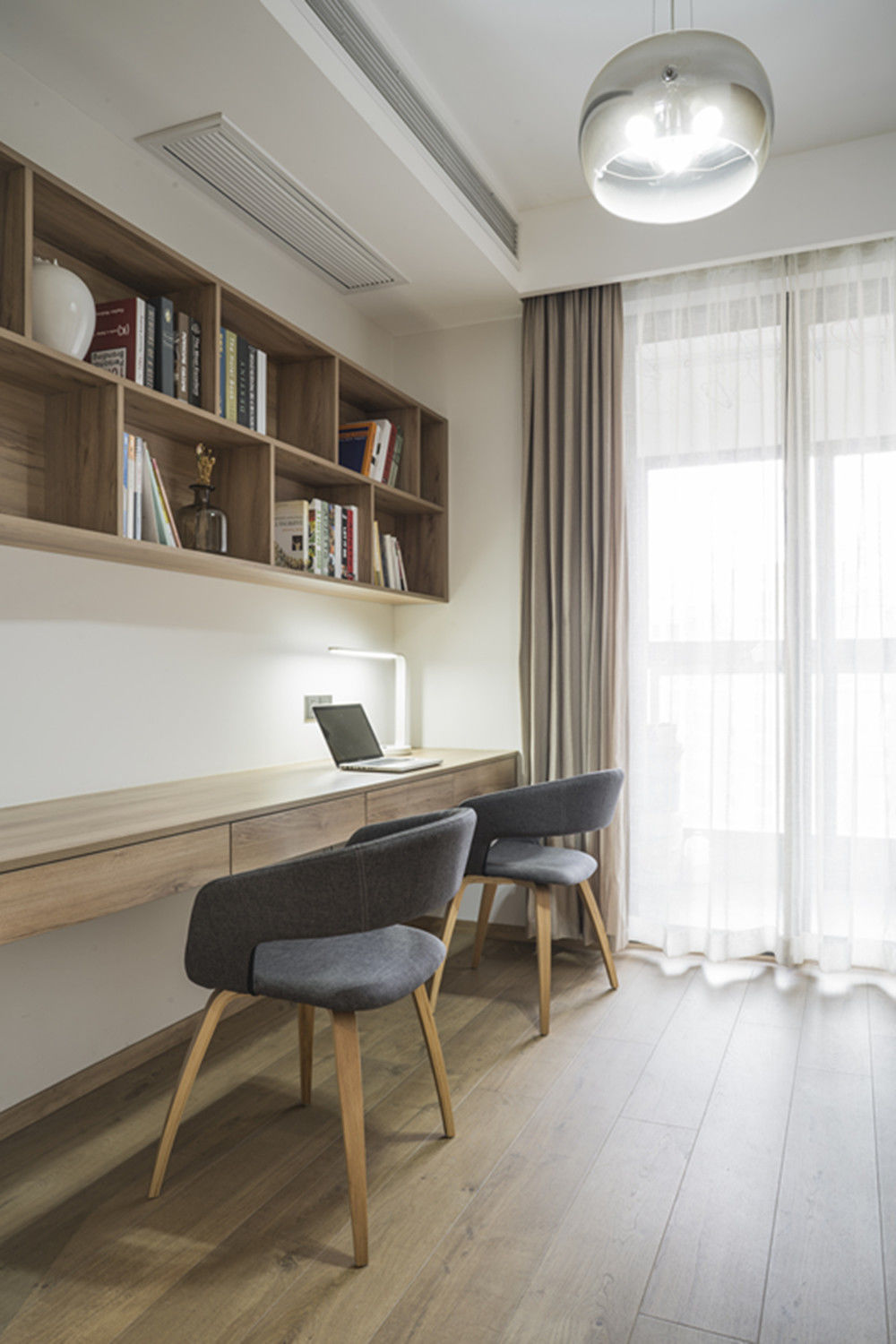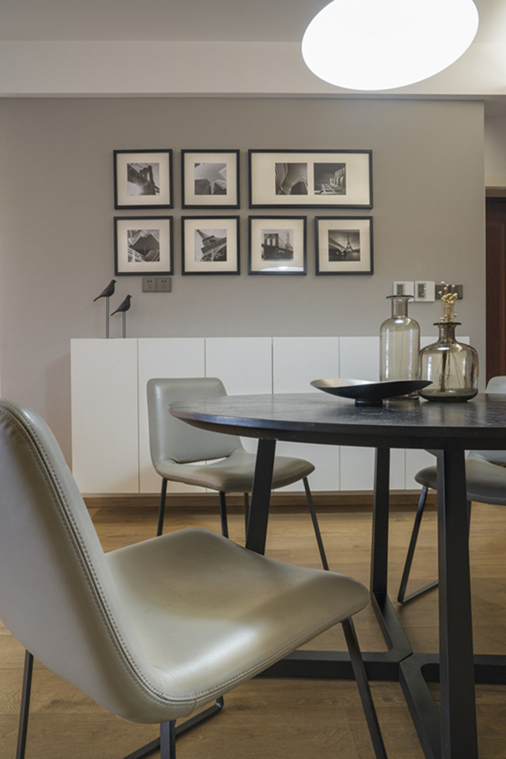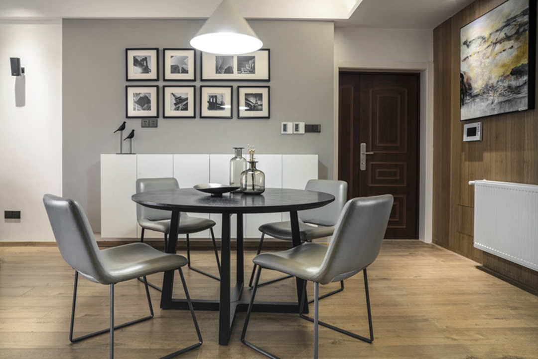 原户型房型方正、保守,新的设计方案使空间分工明确、扩大了就餐范围、合理的空间改造、增添了更多的储物空间。深色地板和大理石,突出了现代风的元素,但同时选用皮质、金属、原木家具硬朗的空间更加精致。