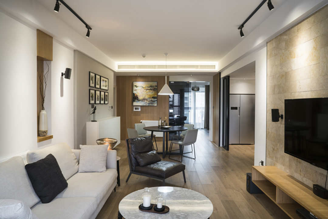 前言: 原户型房型方正、保守,新的设计方案使空间分工明确、扩大了就餐范围、合理的空间改造、增添了更多的储物空间。深色地板和大理石,突出了现代风的元素,但同时选用皮质、金属、原木家具硬朗的空间更加精致。?