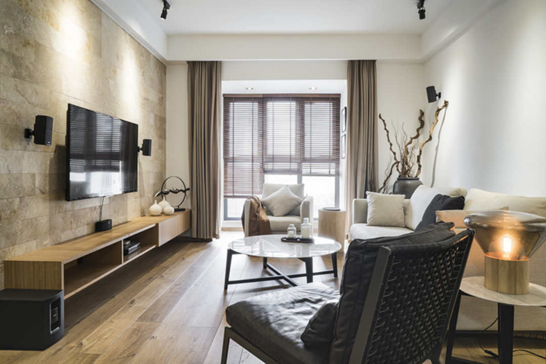 洞石的大理石电视背景墙给生活带来的真实感永远是设计师和生活爱好者们所追求的,简约风的铁艺椅子和黑色的坐垫,简约不简单,使空间复古和现代感兼具。