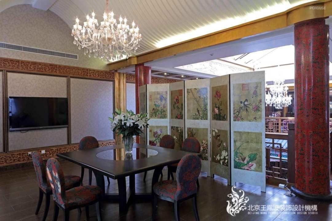设计师在室内设计上,运用大红漆柱、金箔、彩绘,雕梁画栋,挂屏瓷器等装饰,充分表现出了中式设计的气势恢宏,壮丽华贵。高空间,大进深的中式设计精髓!在不慌不忙的端庄稳健中,彰显出大家风范。