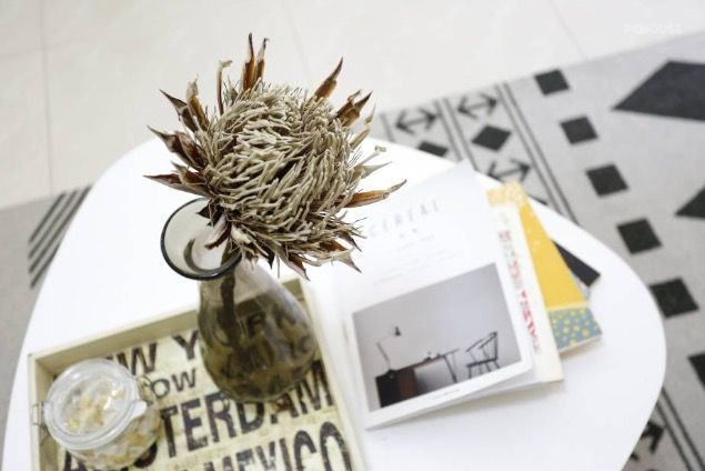 在整体灰色调的基础上,通过不同明度的灰丰富视觉效果。灰色花瓶,带点暗红的灰色帝王干花,灰色的Creal 杂志封面,露出来的黄色书籍封面又让整个画面有了亮点。