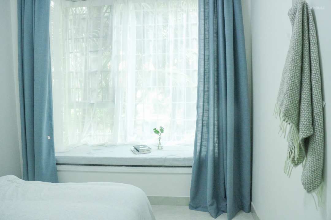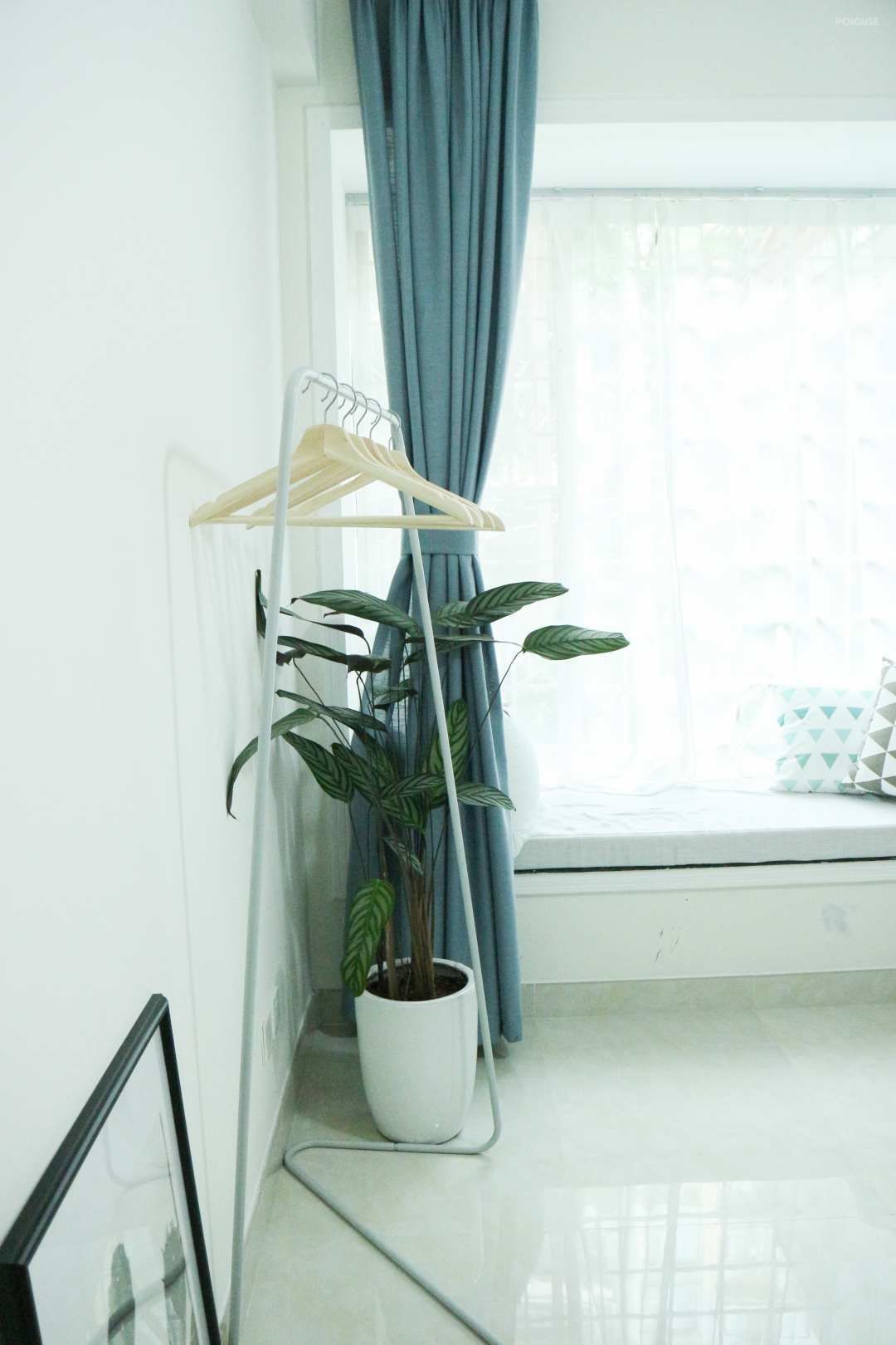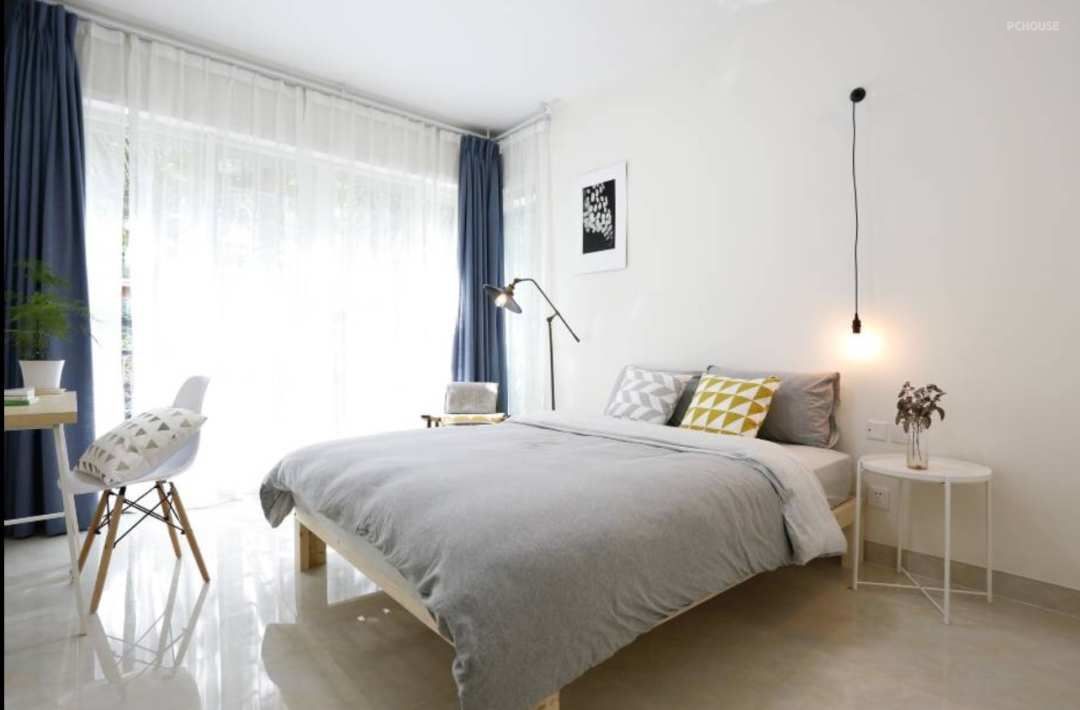 改造后的主卧,原来窗户很大,两面采光,一层纱,一层灰蓝遮光窗帘,事实证明窗帘对整个家居环境的改变真的很大。还是以功能性为主,靠窗的位置放了单人沙发落地灯,适合晒太阳发呆读书。