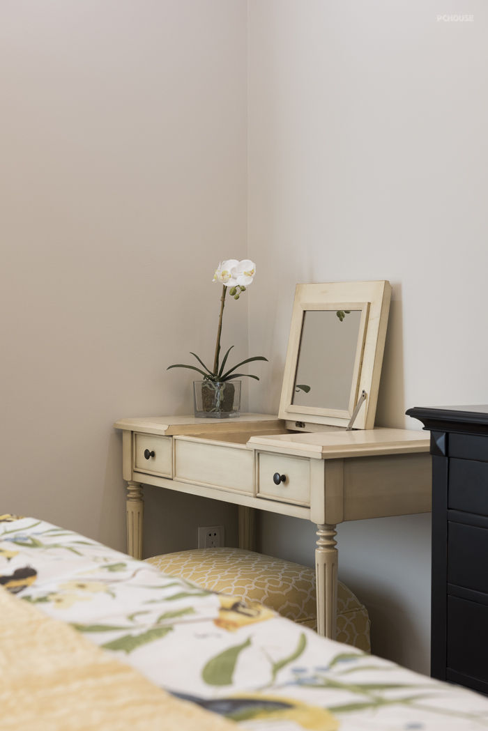与床相配床的对面是一个同色的斗柜,同时具有强大的储物功能(可惜没照到 呜呜~)。在斗柜一旁给女主人设计了一个小巧精致的梳妆台,满足了女主人涂涂抹抹的需求,把镜子放下来也可当做一个小书桌,(女主人偷偷告诉我)将来等孩子大了占领书房的时候可以在这里加班什么的。想想 很是美好!