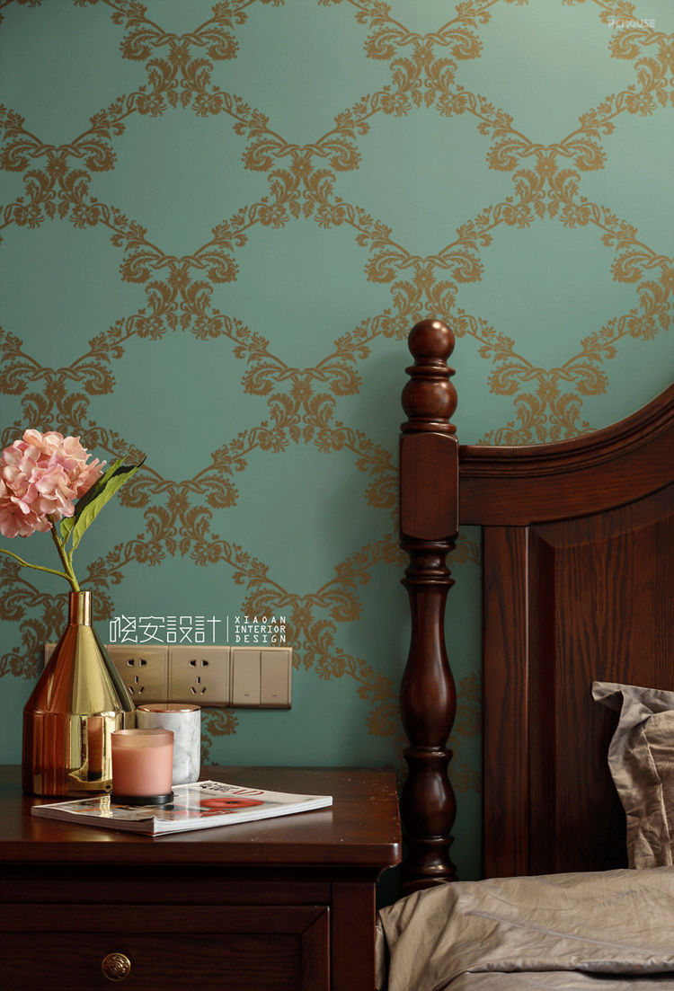 迈入主卧,仿佛走进了一个巨大的珠宝盒,极具奢华质感。铸铜拉手和红木家具的搭配低调而华丽,毛莨叶花纹装点的孔雀绿墙纸仿佛是奥林匹斯山上择取的灵感,飘窗一侧的窗帘犹如华盖一般摇曳飘逸,金色花樽与整体装饰协调一致,是房间中的点睛之笔。 #卧室