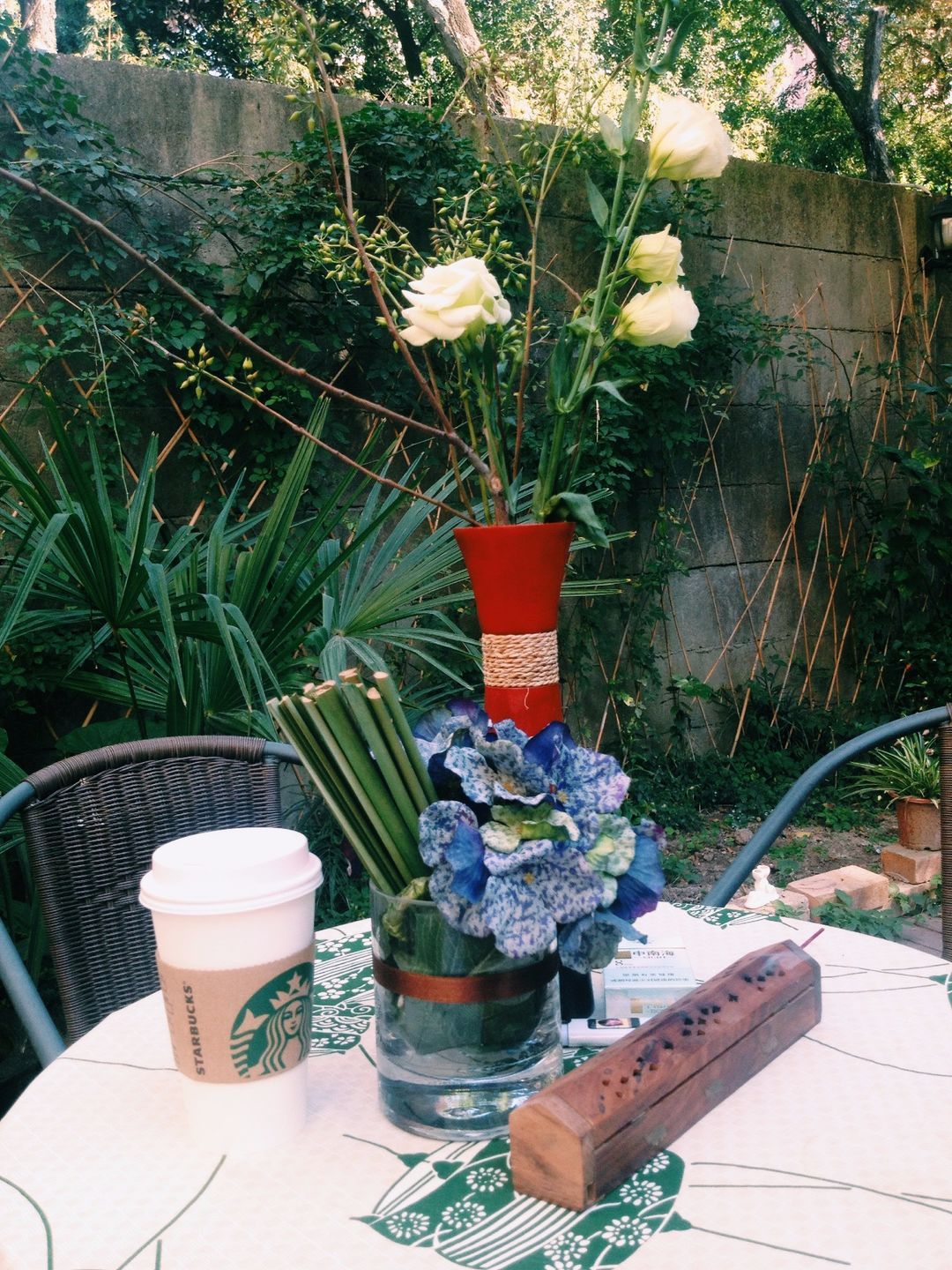 后来的日子,夏日午后天气凉爽后,微风习习,在小桌上铺上了桌布,画图累了的时候,就过来这边休息片刻,坐在院子里,沏一壶茶,等一个老友到来,空气中是绿色的清香。~~