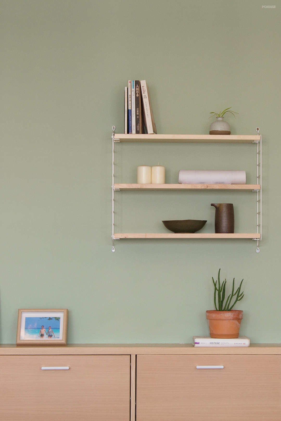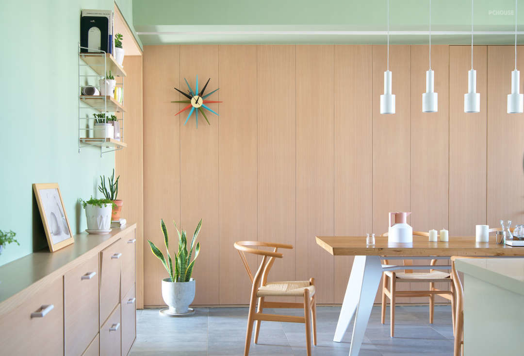餐桌后方的木面墙其实内部藏了巨大的储物空间,四个储物柜足够应付各种餐厅储物。老爸老妈喜欢饭后喝点小酒,家里也少不了许多自酿的杨梅酒、葡萄酒,所以内部隔层按照酒罐的大小体积做了对应规划,方便存取。 #餐厅 我觉得规划一个家很重要的一点是要考虑到今后生活在里面的人日常生活的习惯,小到进门换鞋、饮食喜好、睡眠规律等等,这样设计出来的房子才会比较贴合、住的舒服。