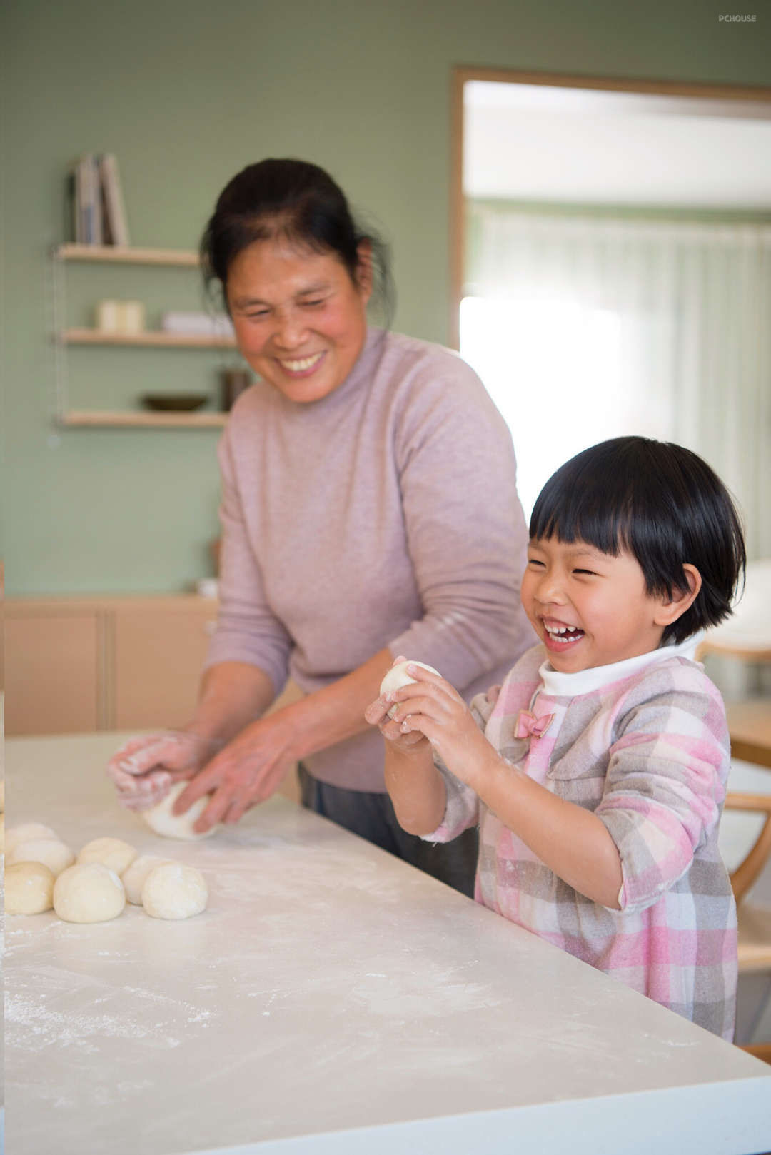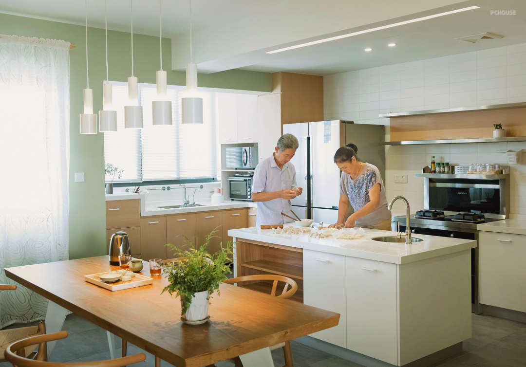 孩子周末来玩,总爱帮着姥姥姥爷一起做面点和饼干这些小零食,亲戚朋友来做客时,也多是围着岛台一边准备食材一边聊天,厨房,是这间屋子的不二主角。