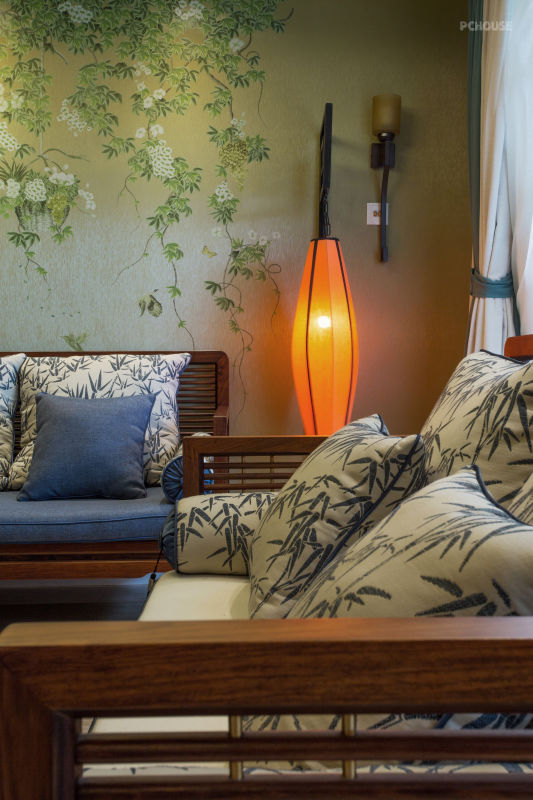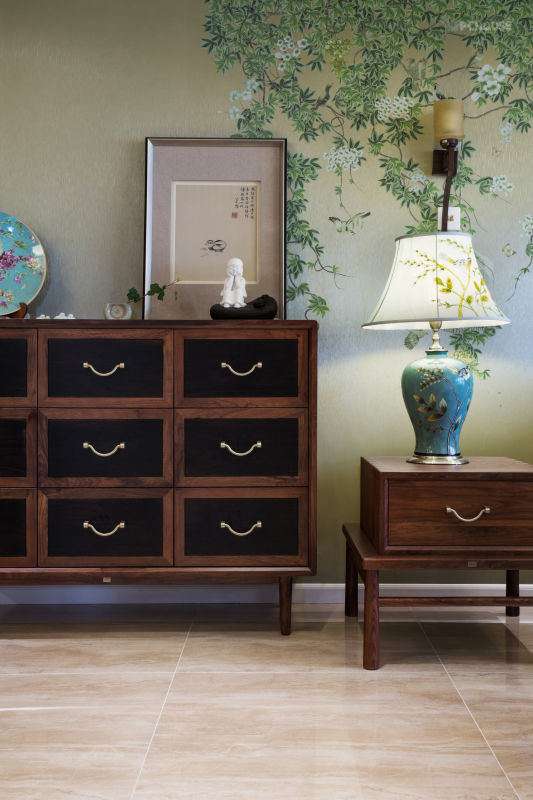 绿色藤蔓的墙纸代替了传统式背景墙面在整个空间肆意延展开来,墙面的壁灯或是边几旁的台灯,四处弥漫着浓浓的写意情怀