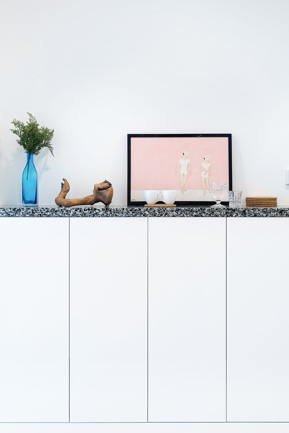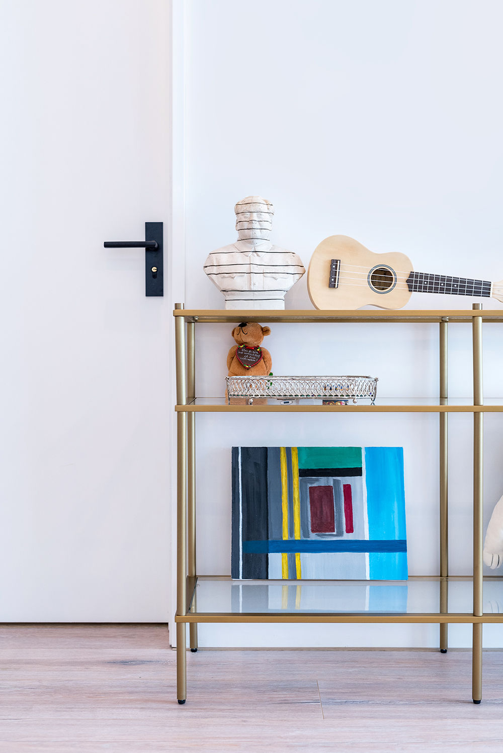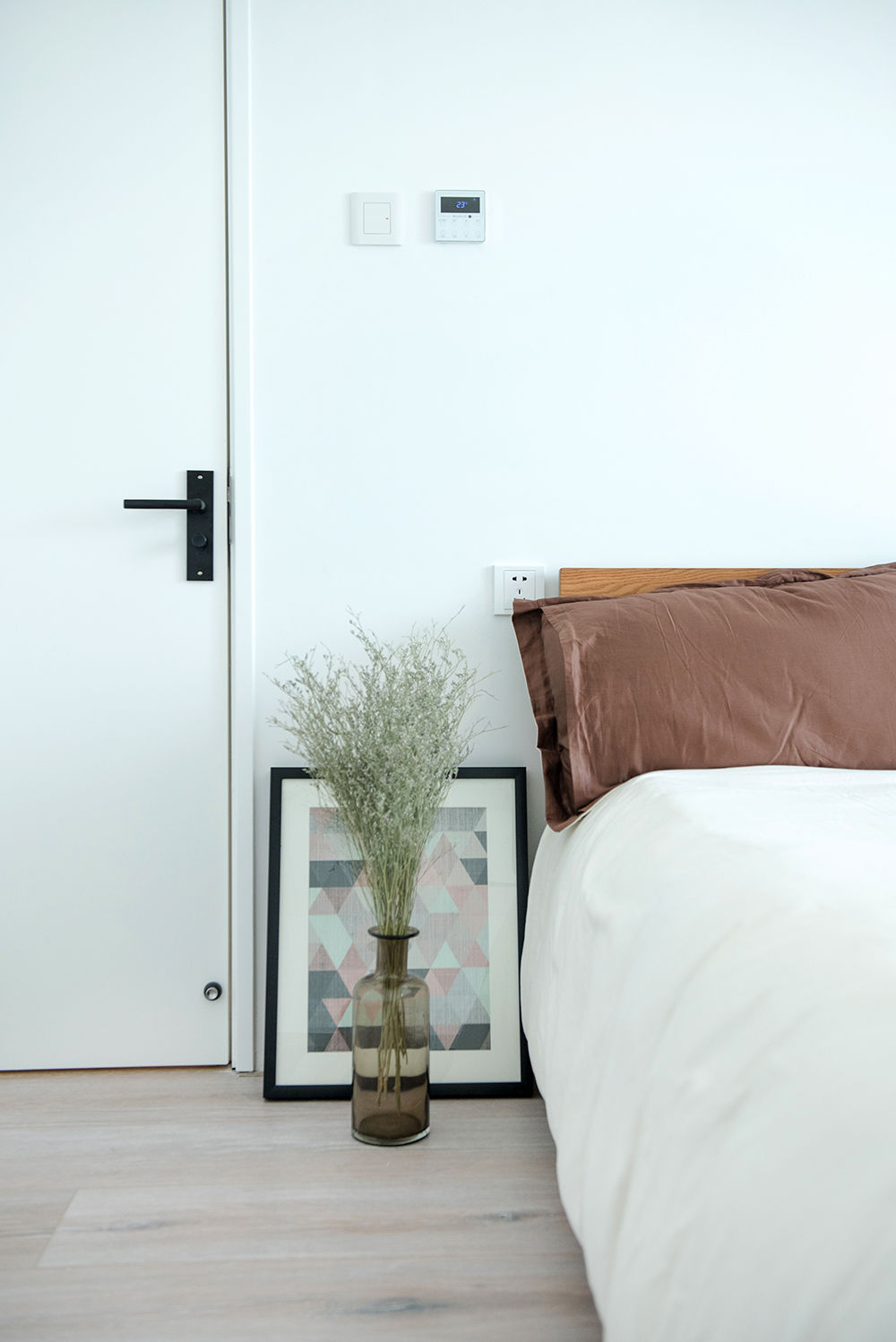 客厅置物架。为了追求极致,全屋没有用踢脚线,而是选择木地板扣条,门套线尺寸也是异于普通常规尺寸,这一切都是为了在细节上达到去线条,做简化。