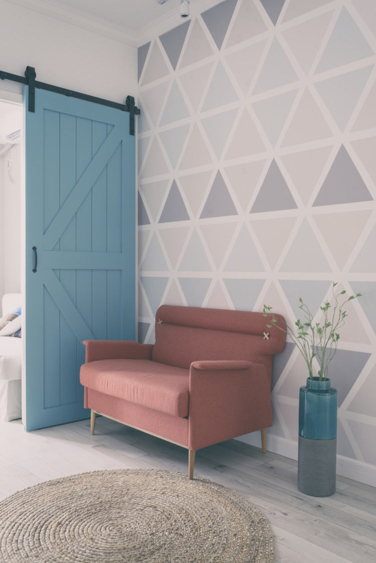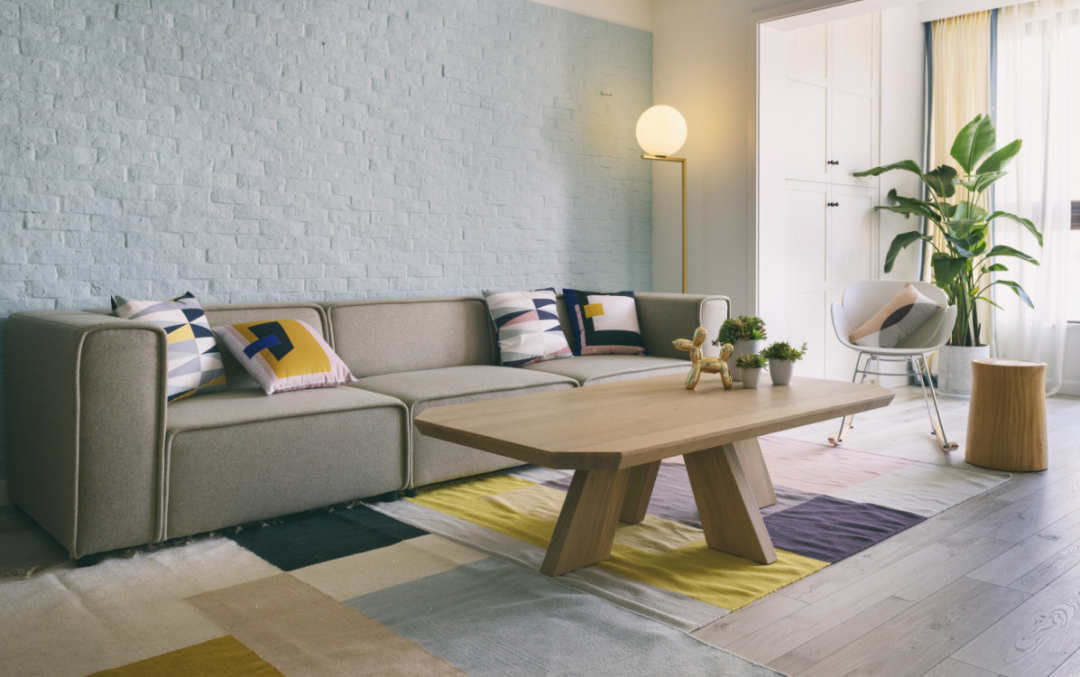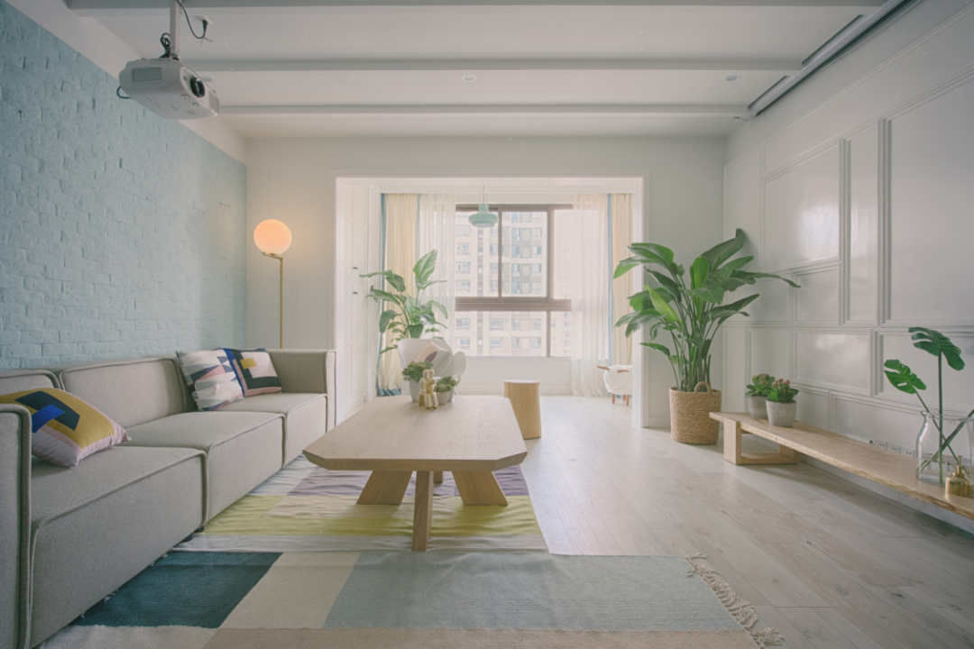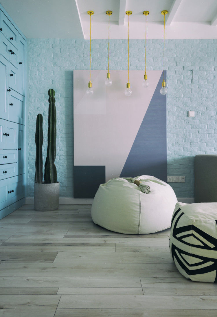 沙发背景墙是刷成淡蓝色的文化砖。沙发的直角和硬朗的茶几形成统一。地毯不规则的方块,也是几何的元素。