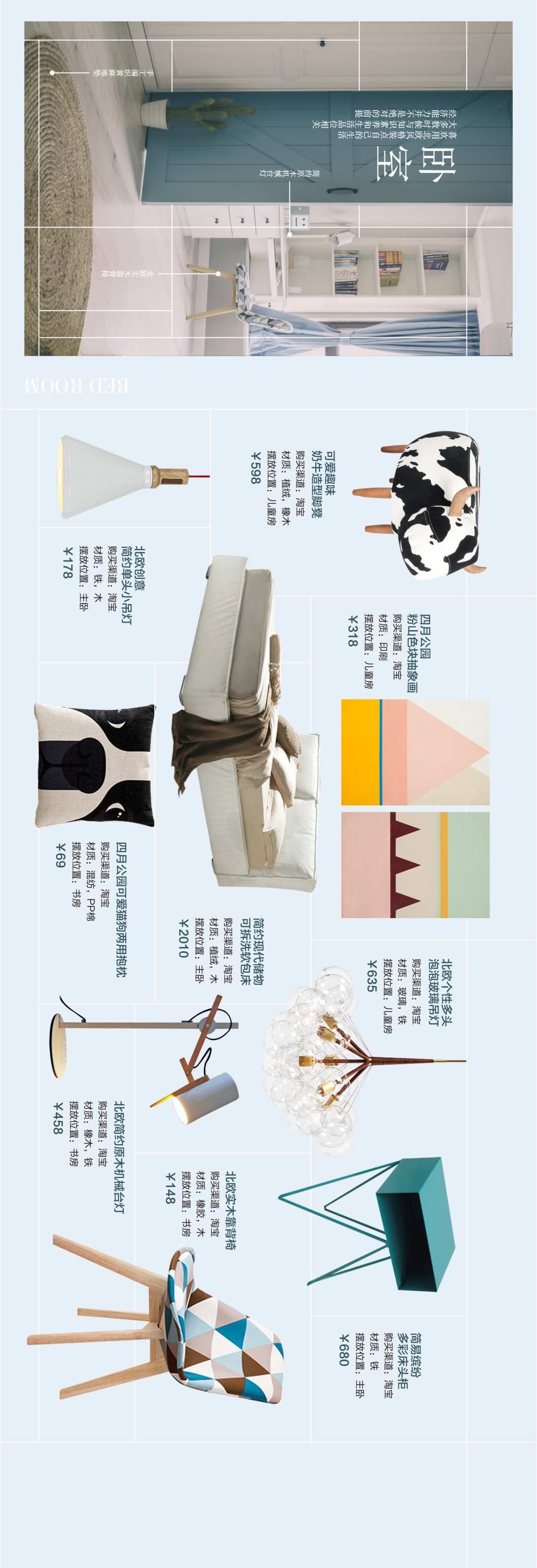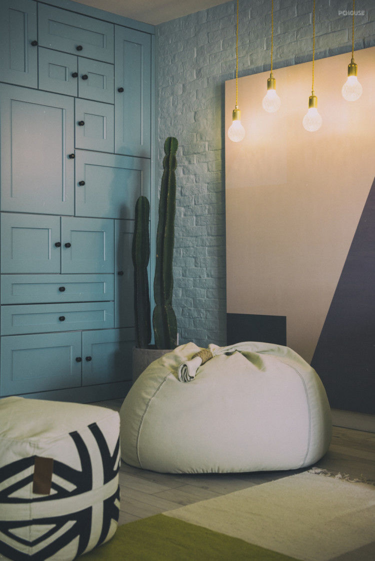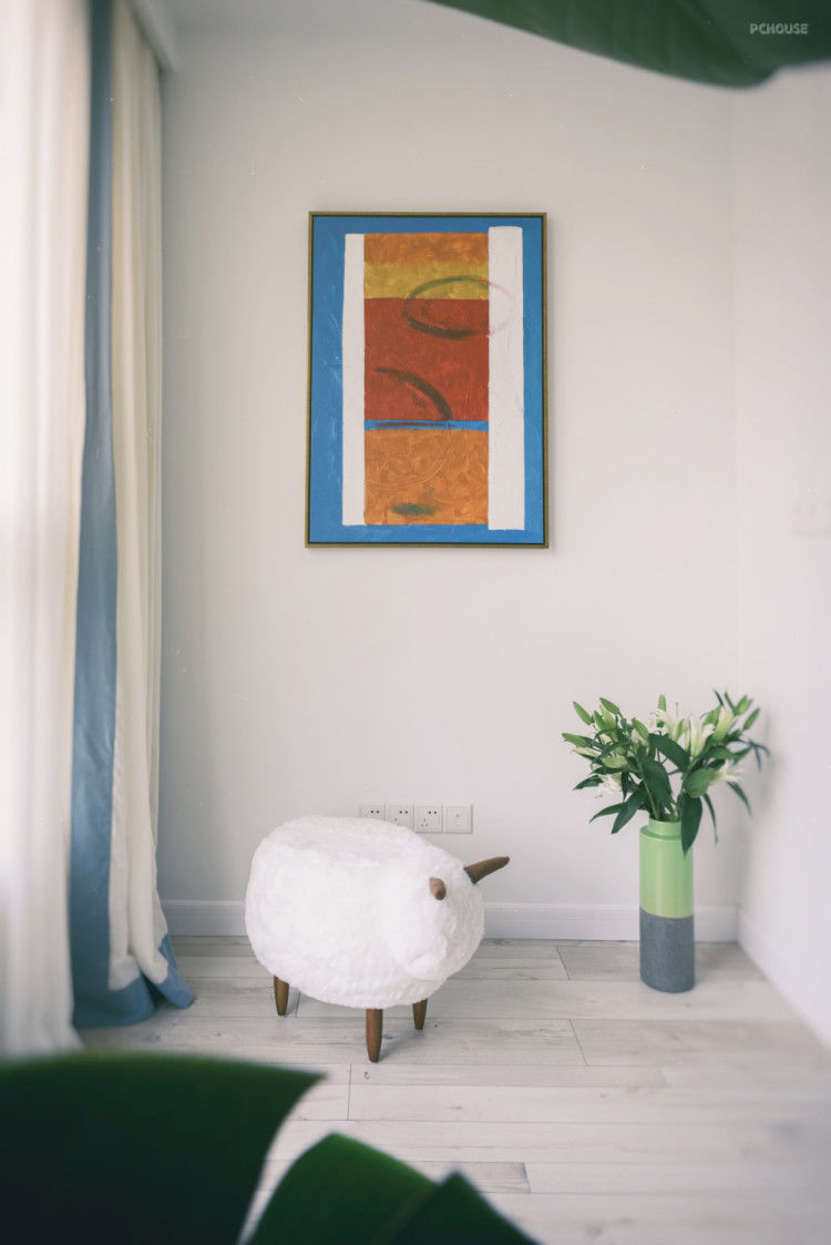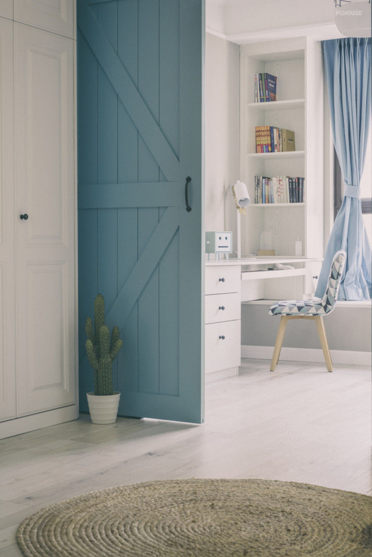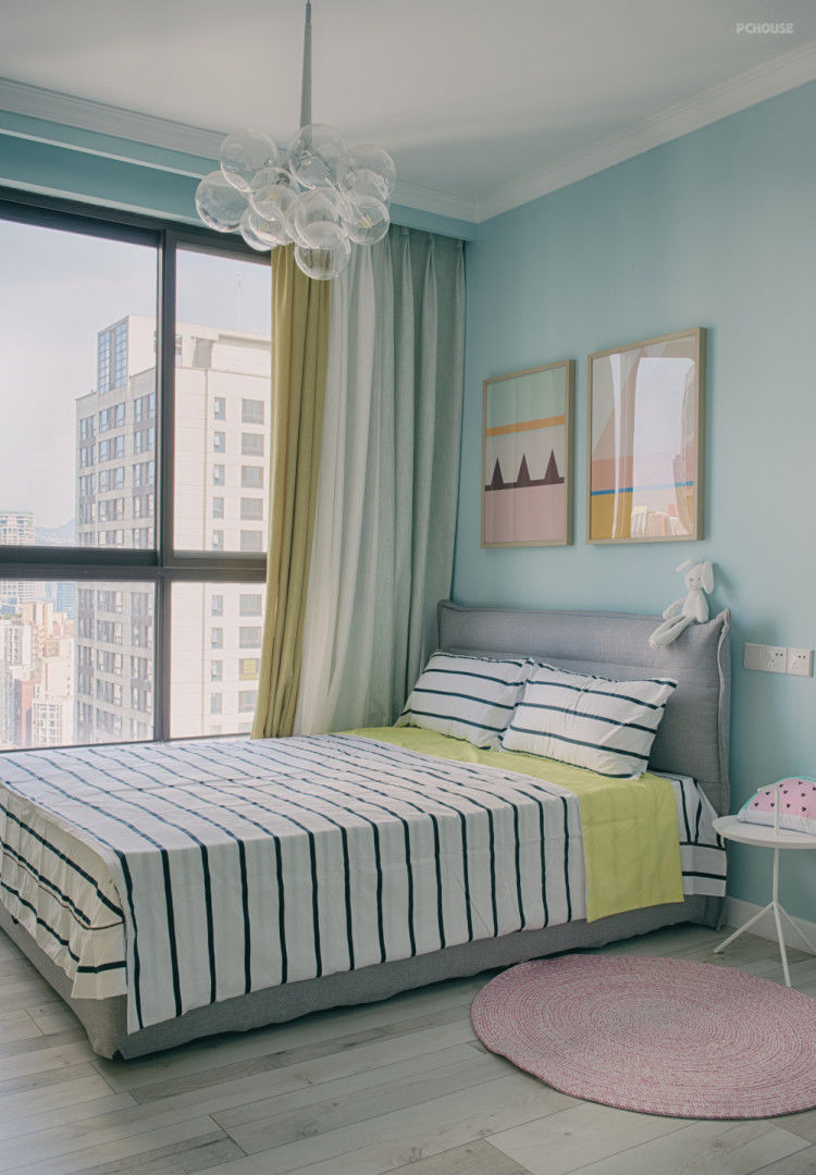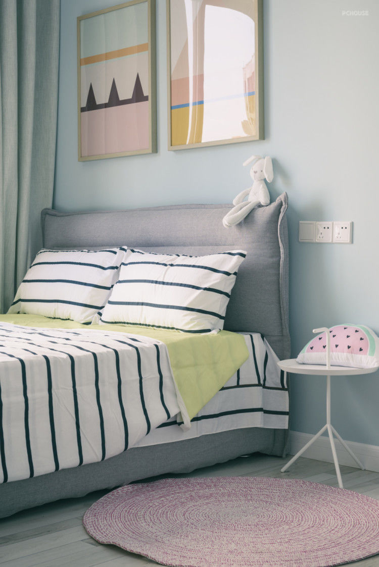 清新自然的儿童房,轻松自在,充满了童真童趣。墙上的蓝色和主卧一样,位置由天花板换成了墙面。装饰画是不规则的几何图形。