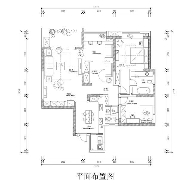 改造布置图,增加休闲区与阅读区,入户的空间从原本狭长的过道改为现在开阔的西厨,让空间有更多的变化。