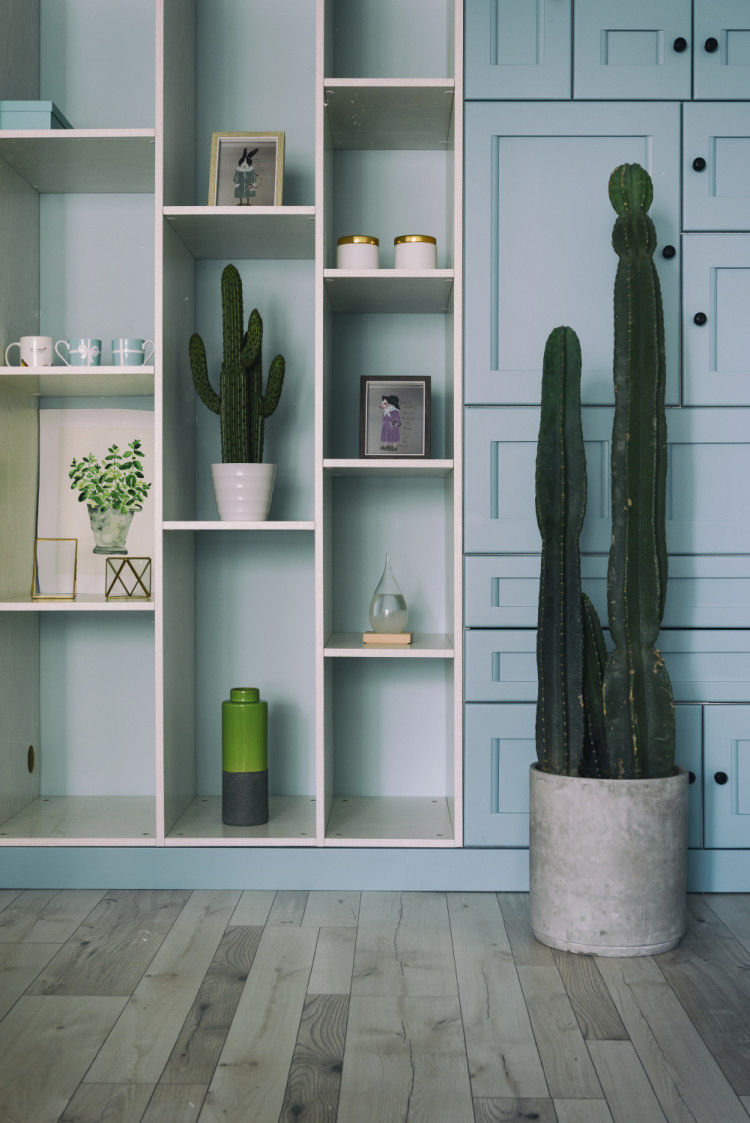 柜子的正面是这样的,有可以打开门的柜子,也有做了隔断的书架,全部来自于设计师的手绘样品。没有做成清一色的蓝,让色彩更丰富。