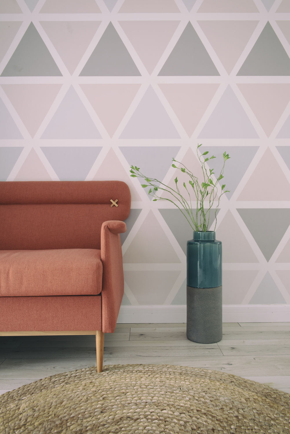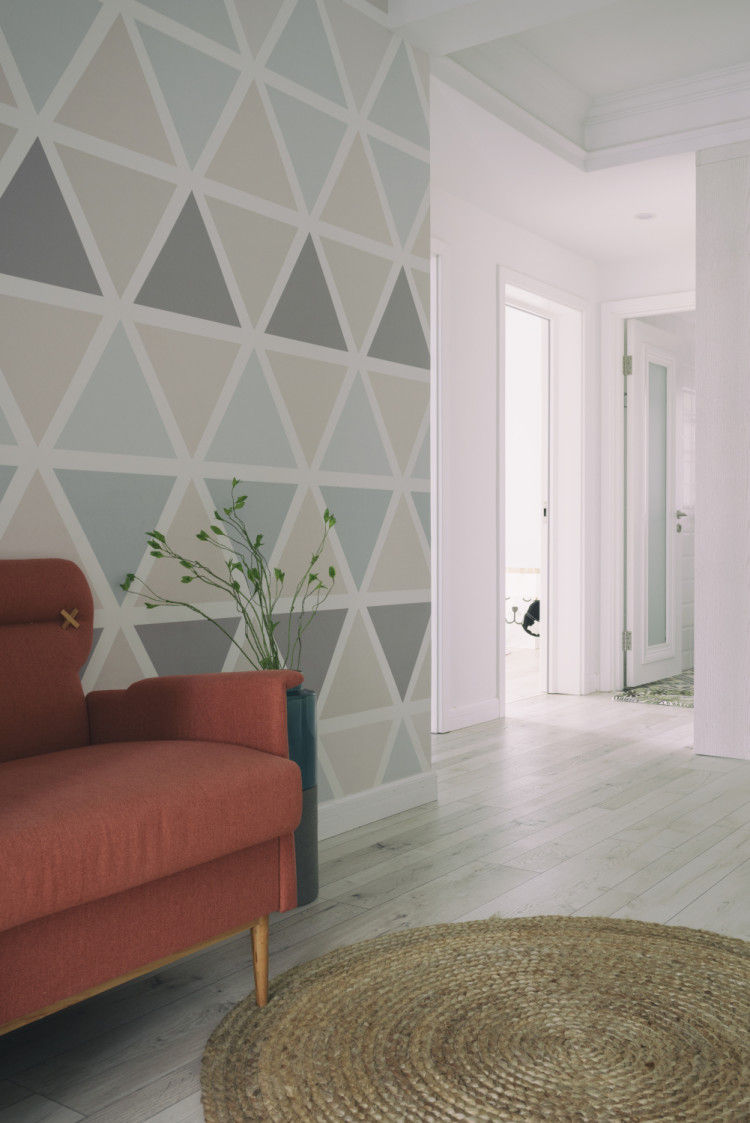 红沙发加上几何图案的墙纸,向侧延伸的位置即是房间。