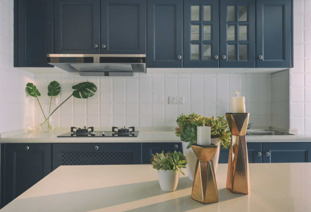 厨房的橱柜是清一色的深蓝色。考虑到业主与父母同住一个小区,日常吃饭的问题几乎在父母家解决,偶尔在家也只是制作一些简餐。所以家里没有餐厅,只有大大的岛台。