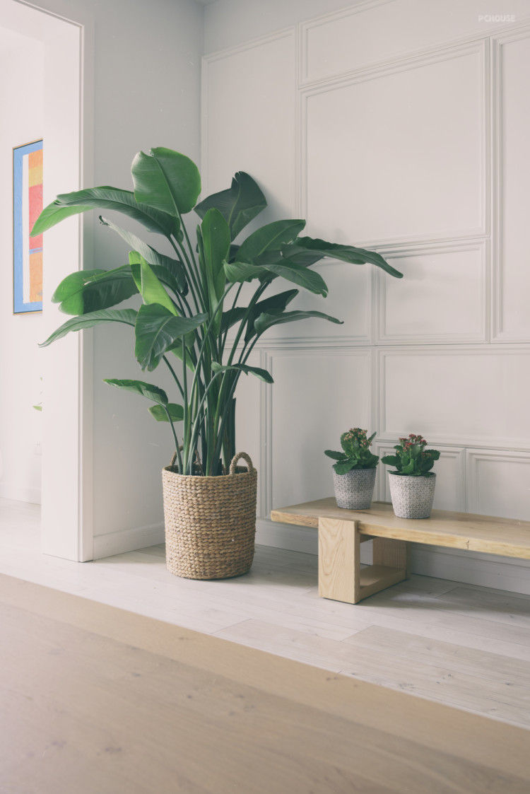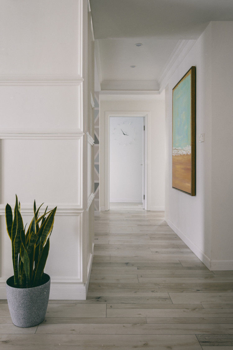 走廊没有过多的装饰。绿植依然是整个空间最大的亮点,与墙上的挂画相互映衬,在白色的走廊里显得统一又随性。