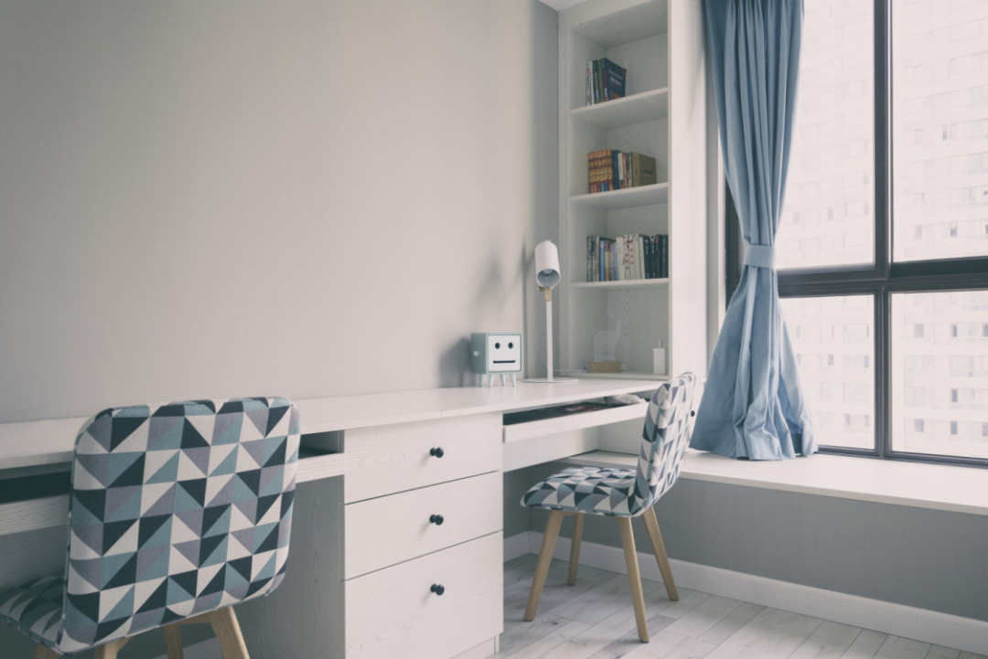 书房的两张椅子,搭配书桌,满足了业主小两口的分区玩游戏偶尔办公的需求。书房的窗帘是蓝色,椅子上也有蓝色的三角元素。