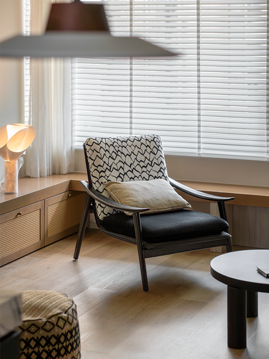 本案在原始户型的结构上做了些调整,让入户门厅到客餐厅的空间通透性 。更好完整,同时更好的利用了空间来满足生活的储物需求(餐厅隐蔽的储物柜,卧室的衣柜规划),室内统一和谐的色彩氛围,营造了温馨舒适的生活气息。墙面刷漆壁布细腻而有质感,深胡桃木色装墙板和家具,地面选用天然黄洞石和胡桃木色地板的完美结合