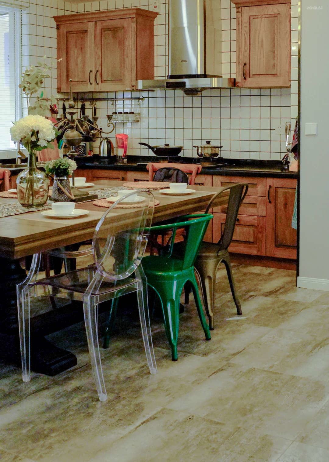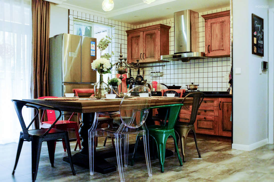 客厅、餐厅、厨房没有明显的分割,这样让空间显得通畅,餐边柜与客厅的柜子成套,显得整洁而统一。