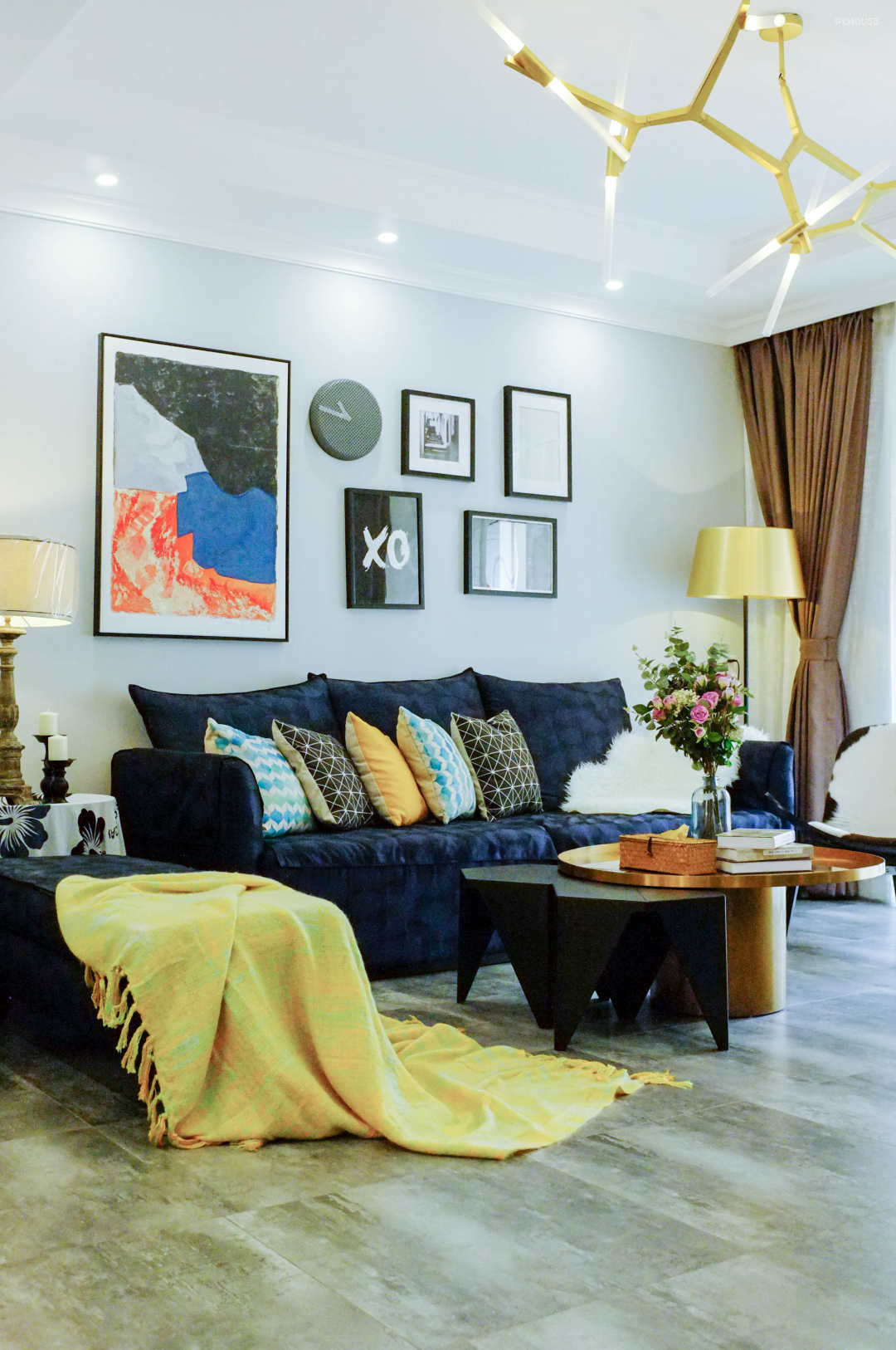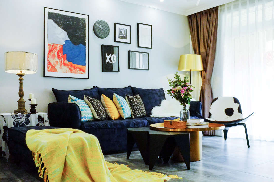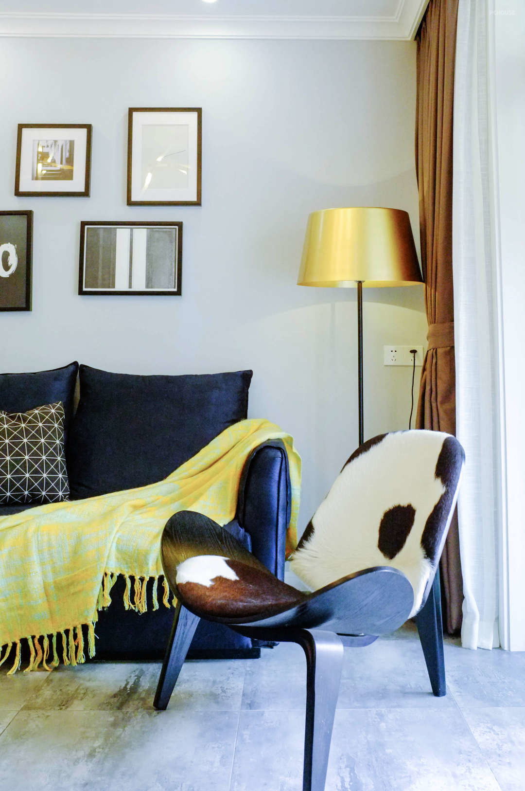 客厅以浅灰色为主基调,搭配深蓝色,简约的家具组合使空间显得平静,明黄色金属质感落地灯不仅照亮一隅,且让房间显得灵动。沙发背景墙上的抽象画组合与空间相融合,增添几分趣味。