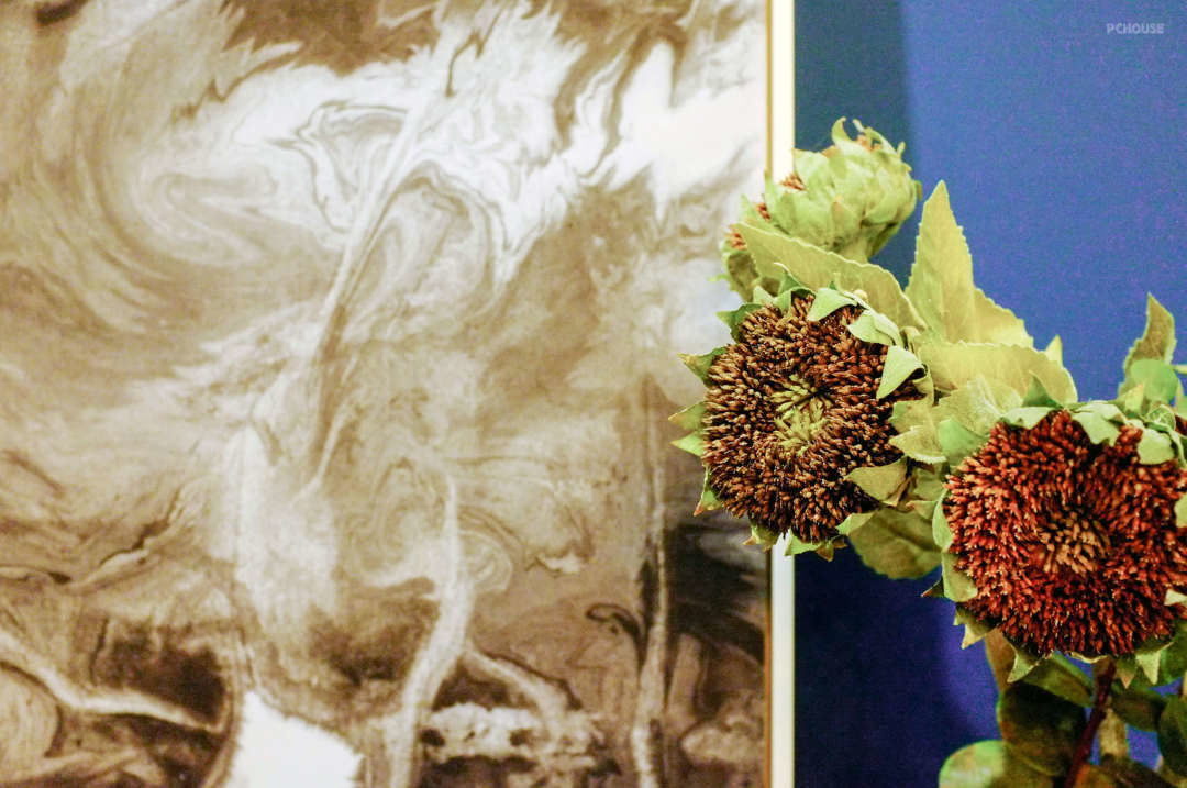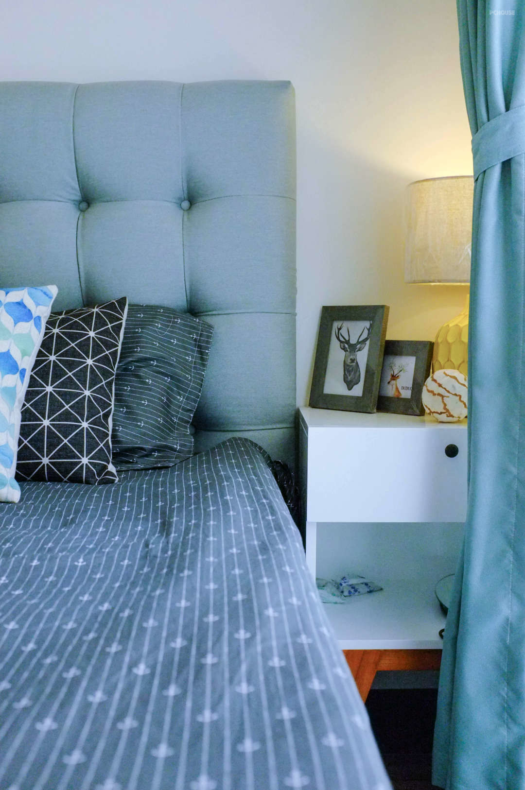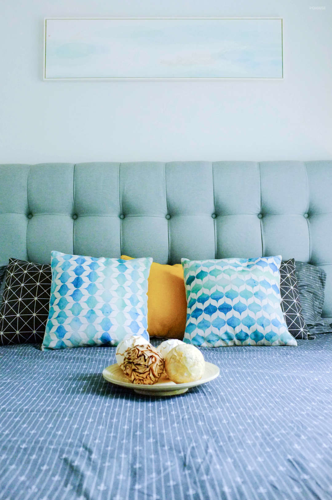 客厅以浅灰色为主基调,搭配深蓝色,简约的家具组合使空间显得平静,明黄色金属质感落地灯不仅照亮一隅,且让房间显得灵动。沙发背景墙上的抽象画组合与空间相融合,增添几分趣味。