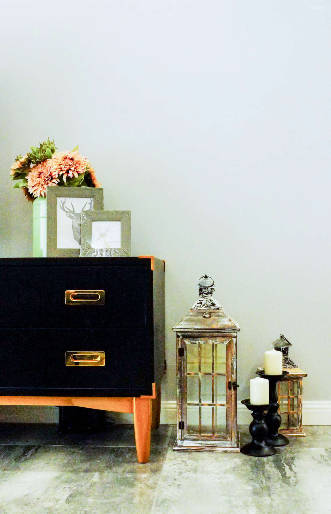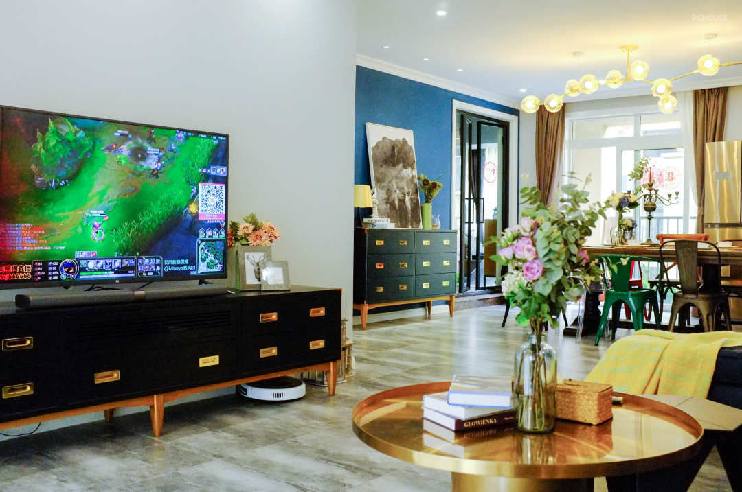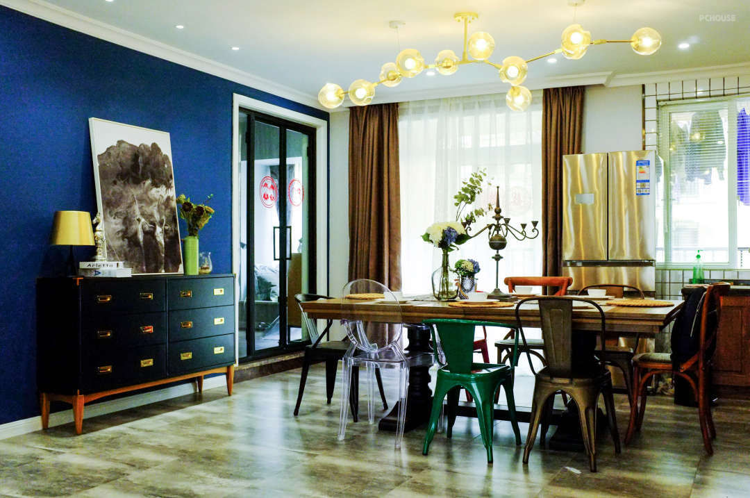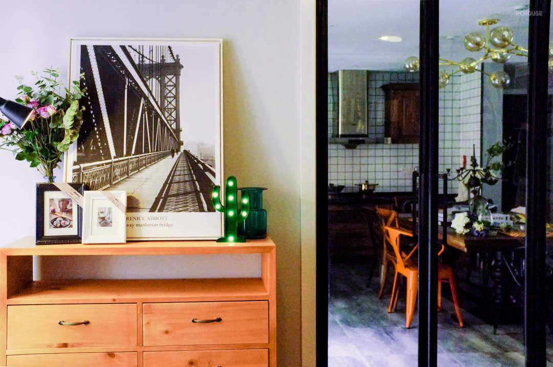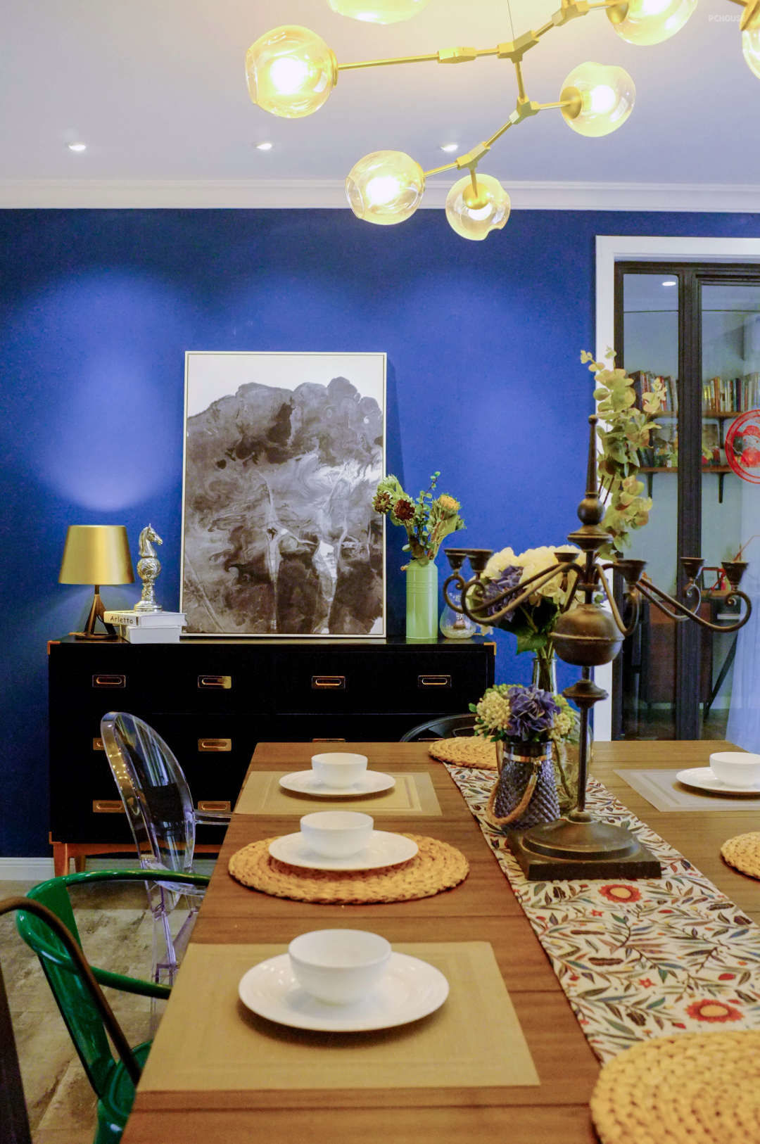 餐边柜这一面深邃蓝色的墙赚足了眼球,精致的黑色木质餐边柜以金属色作点缀,再与抽象画的搭配,让这个过道显得特别。