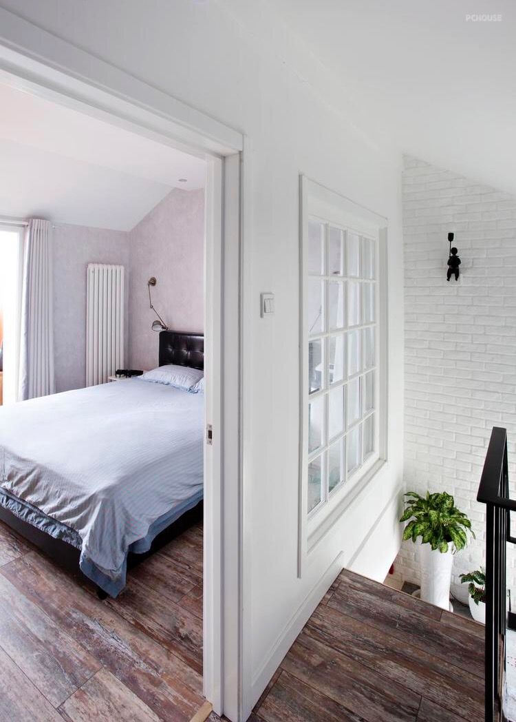 将二层卧室与楼梯之间的墙体做成了假窗,这样就不用担心楼梯采光问题了。并且在假窗的内侧安装了窗帘,这样也保证了卧室的私密性。