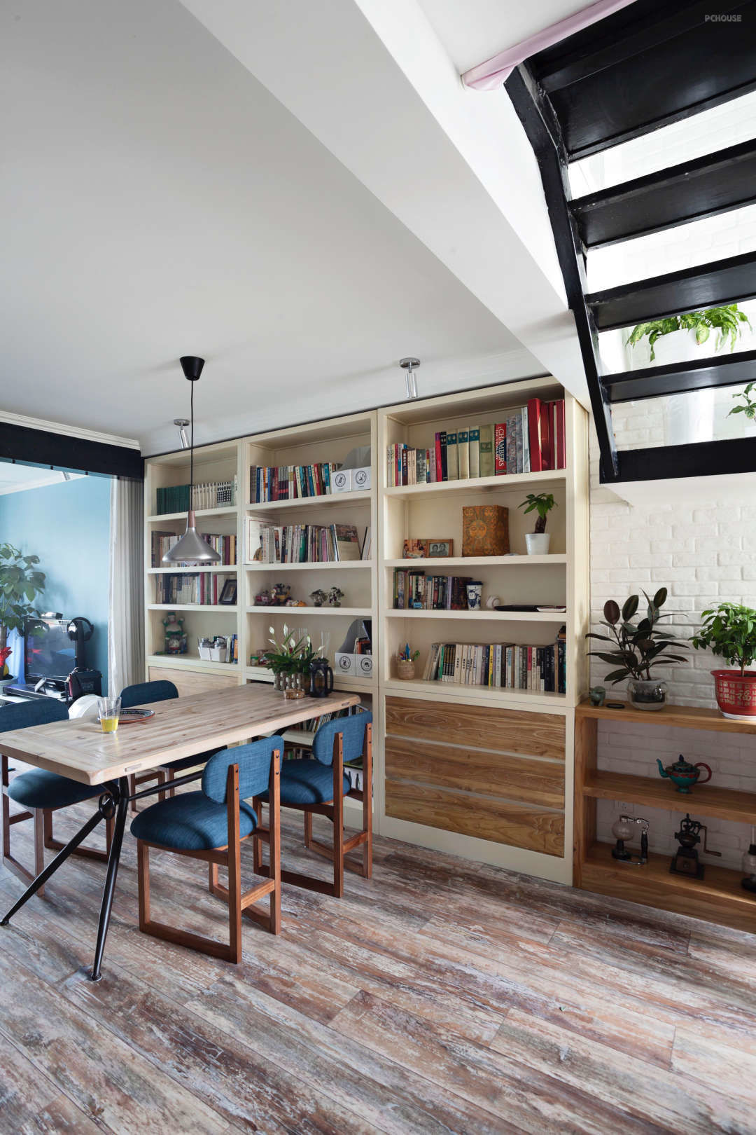 业主比较喜欢颜色稍微重一些的原木材质,即使是这样,还是需要用一些不同深浅层次的木色区分,增强了视觉感。餐桌选了下部镂空的,桌板也是比较薄的,这样通透感会更好一些,餐椅配合了布艺的蓝色。组合柜上部分是透空,用来放书籍和展示物品,容易拿取和观看。下部分用了抽屉,储藏一些展示性并没有那么好的物件。
