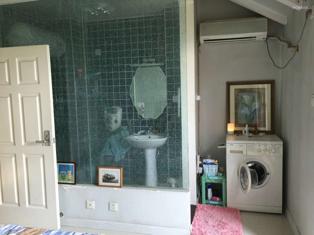 改造前主卧卫生间和洗衣房角度的照片,卫生间过小、洗衣机的位置也并不舒服。每天睡觉都要面对这样杂乱的一面墙,很是影响心情。