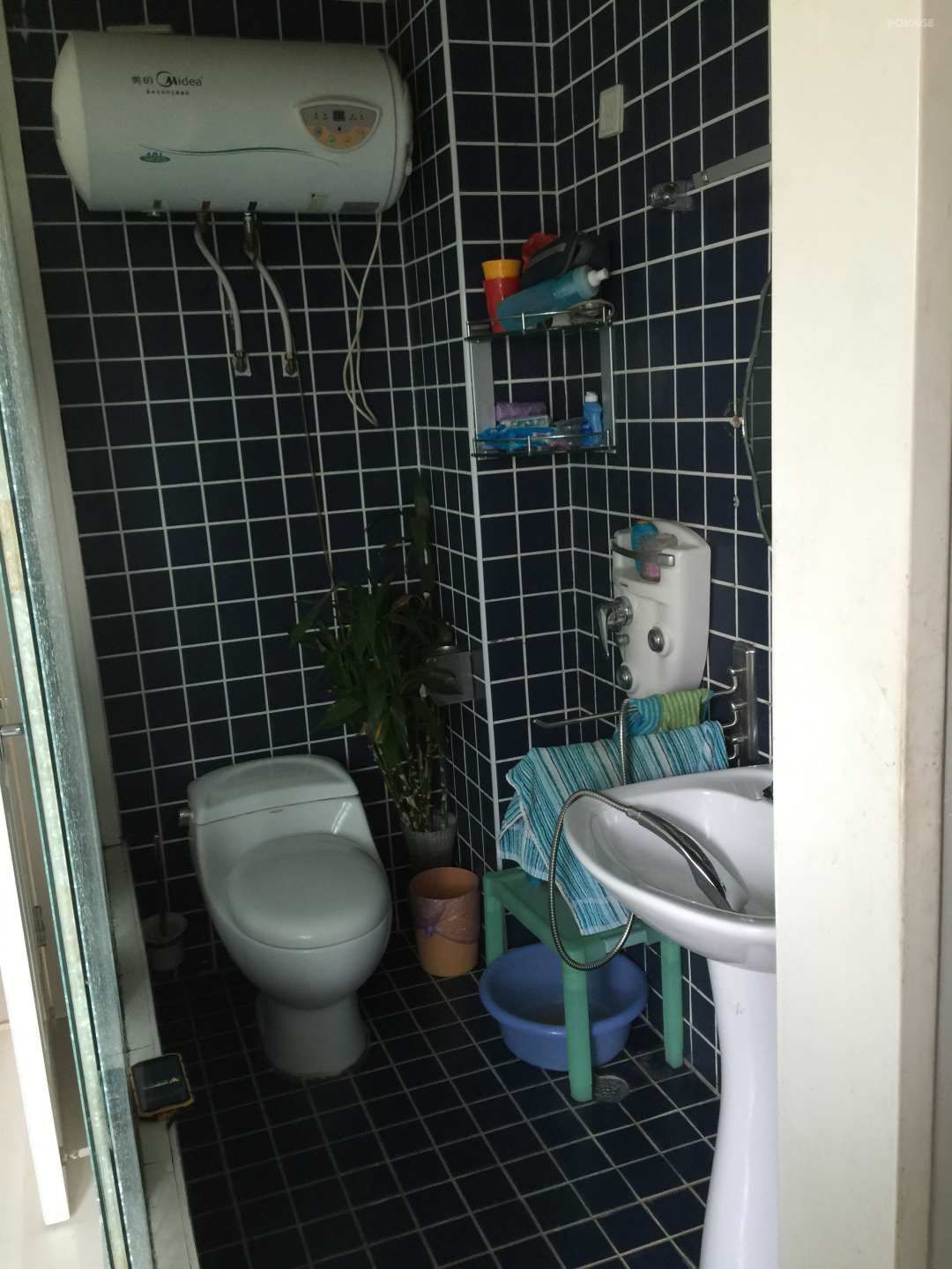 改造前二层卫生间的照片,马桶、淋浴、洗手盆全挤在了一个不足2m?的空间。