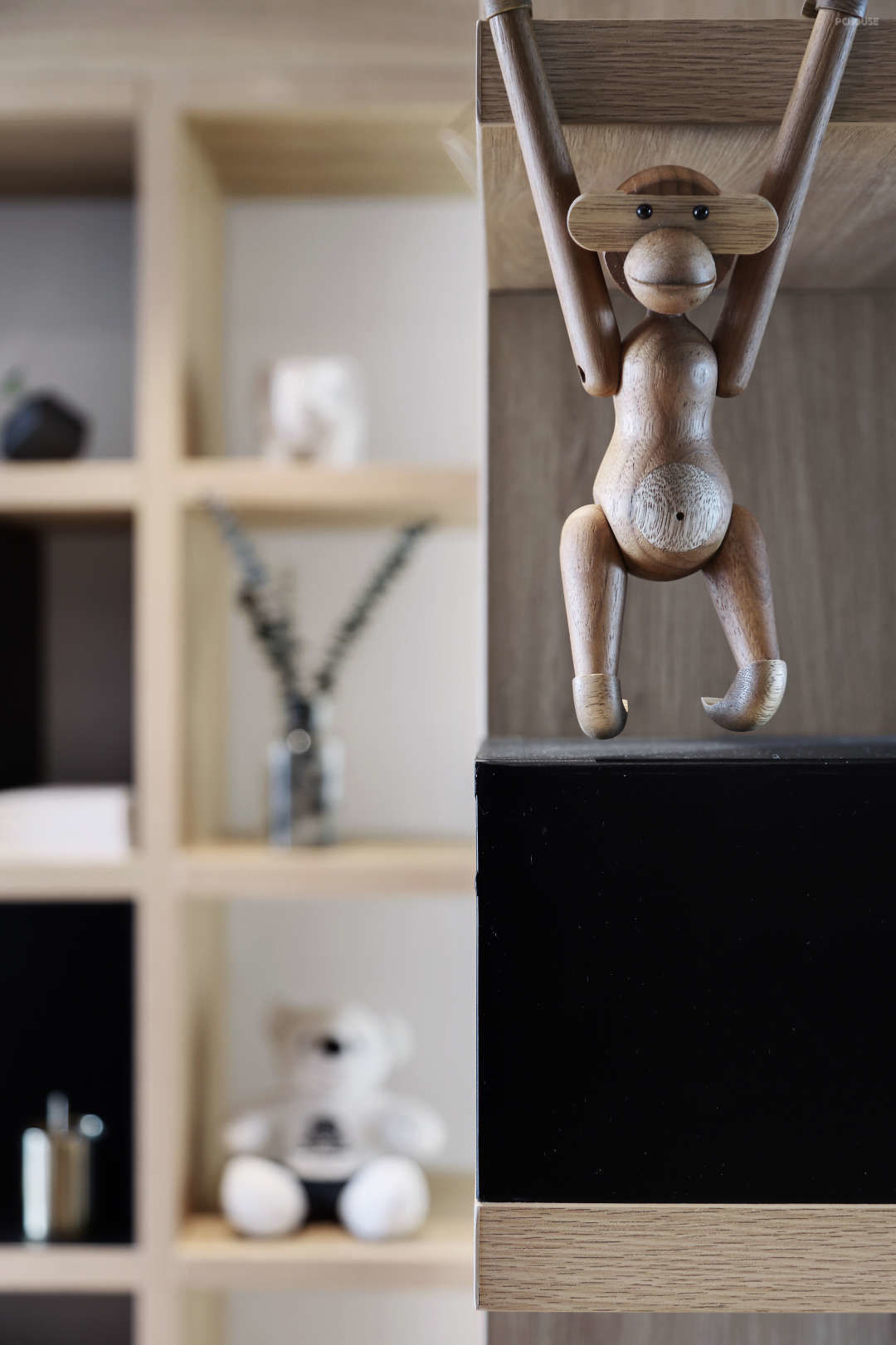 卧室电视旁边的不规则柜体是后面为了遮盖壁挂空调的管子才加的.整个造型也是用不规则块体去做叠加.值得一说的是洗手台与梳妆台的结合.由于这种房子有消防管在顶上,为了包住管道,做了造型形成下出光.镜子用了黑色不锈钢条收边.两片正方形镜面中间有个白色墙面.上面凸出一块.是由于这边包了个比较粗的下水管道.包的造型与台面结合,不仅不突兀,反而起到了画龙点睛的作用.台盆用了台上盆,台盆下面是开门,右边梳妆台下面是抽屉.中间是黑色敞开格.最下面做了一个层板用来放浴巾.同时做了下出光设计让整个洗手台面显得更加轻盈.