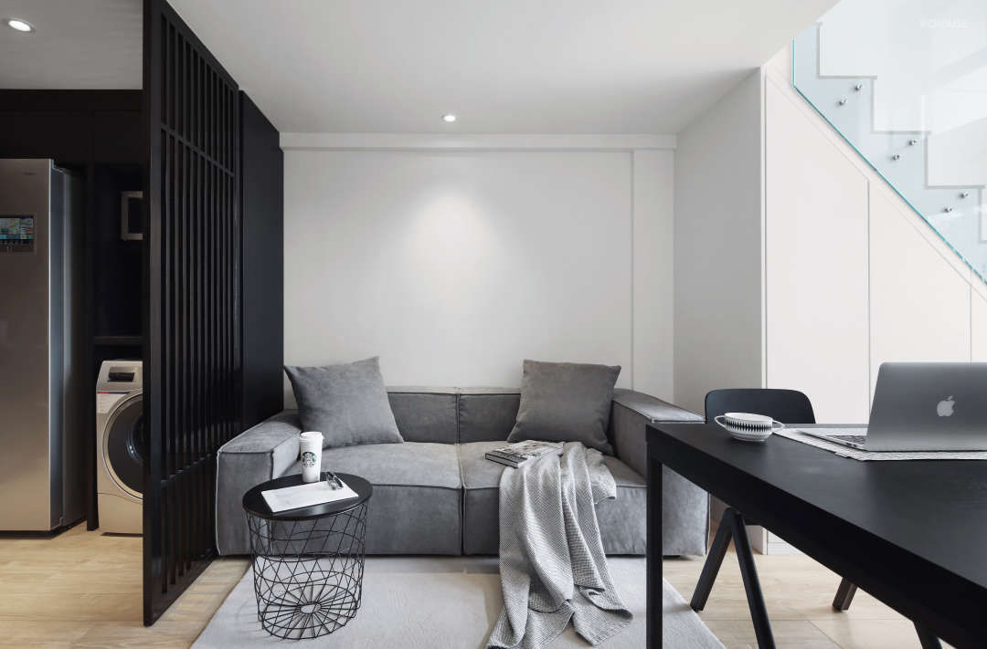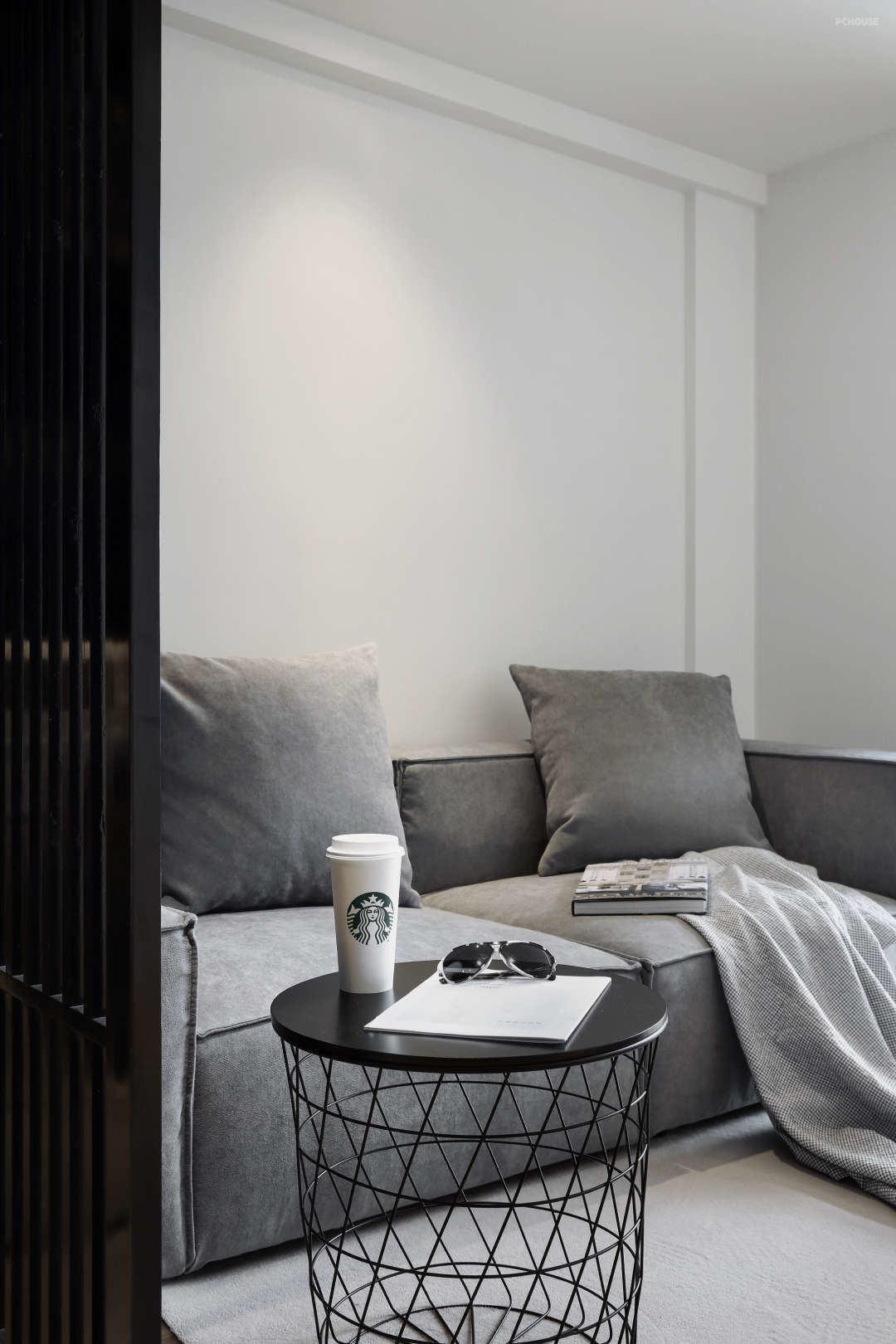 沙发位置其实在之前设计的时候就留好了位置,空间留了2300.沙发用的2100.沙发靠着屏风放的,右边留的位置以后可以放个黑色小梯子.而且那边也正好预留了插座可以手机充电.沙发性价比很高,质量也不错,整个立体感造型个人特别喜欢.关键还是组合形式.沙发背后还少一幅从国外海运过来的北欧画.时间原因缺席了沙发上面的射灯就是特地为了这幅画而设计的.客厅区域基本上都是点光源.全部用了射灯.安排在需要重点照明的地方.射灯光源全部采用了中性光.