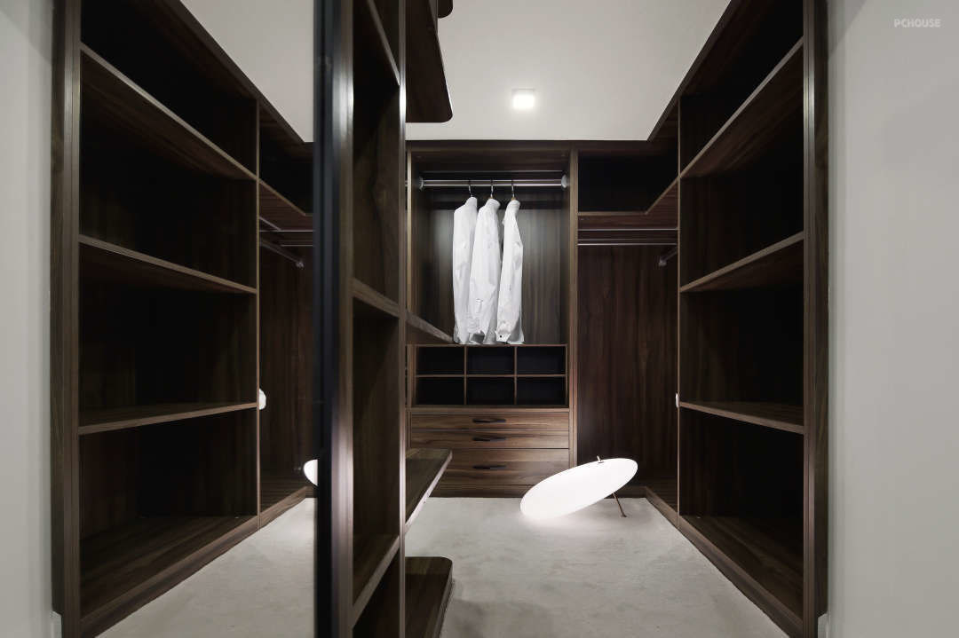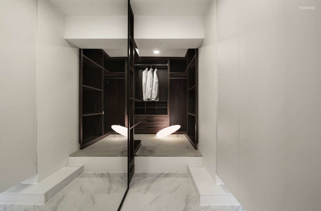 衣帽间走到因为做了一个白色的悬空壁柜,为了在视觉上让过道显得不那么压抑,左边墙体做了一整面的落地镜.正好当作衣帽间的全身镜使用.衣帽间之所以有高低差.因为这块空间是之前开发商赠送的过道面积,下面有根地梁.衣帽间内部的空间有1.78米.由于层高刚好站一个人.下面只铺设了一层地毯.让层高能够尽量高一些.
