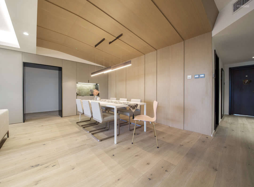 餐厅的墙面和顶面,采用了定制的成品木质饰面板,选择较浅的木皮颜色使成品有一定的包围感但并不压抑,配合柔和的灯光,使餐厅的氛围非常温暖温馨。限量版粉色椅子的点睛,增加了活跃的气氛。餐边柜也结合到了整体壁柜中。