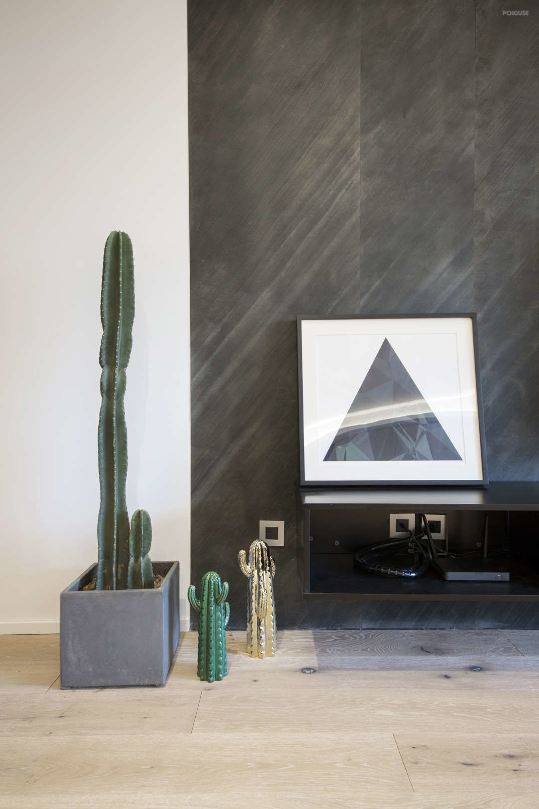电视墙采用了超薄石材贴面,拥有天然石材的质感和纹理,但施工工序却大大简化。这片重色的区域在视觉上可以减弱客厅的空旷感,深色背景下看电视,眼睛也不容易疲劳。