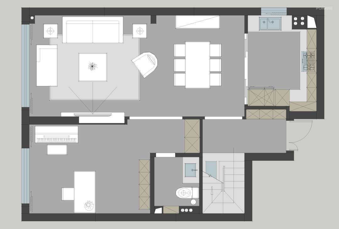 2.拆除原客厅和卫生间墙体,让书房尽可能的变大,融入到客厅餐厅一体。