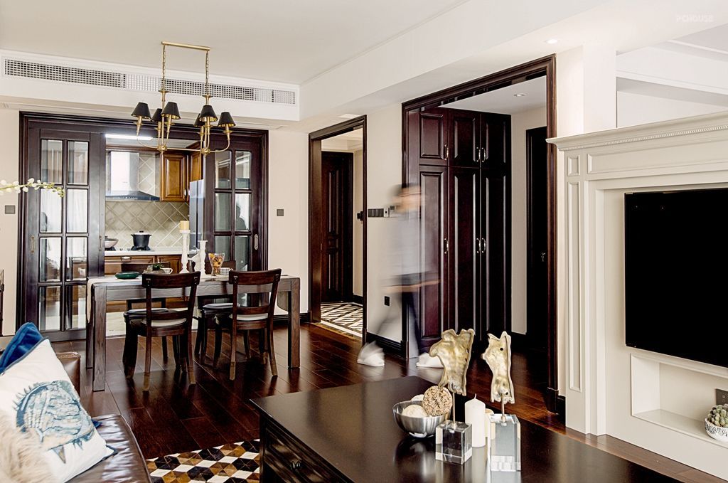3.电视墙采用壁炉形式,现场制作基础,表面进行贴同护墙板色结构,形体上比较精致,同时和沙发墙色进行呼应。
