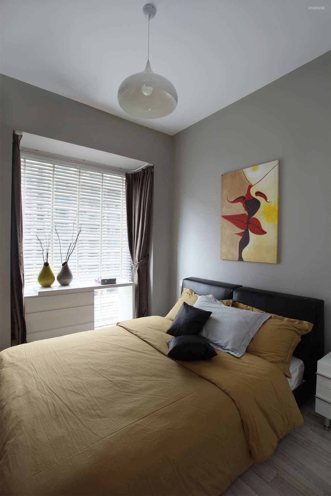 墙面整体都用了灰色,床头用了壁画进行装点让整个墙面不显得空旷,反而充满了灵动感,床体用了黑色与灰色的墙面有一种协调之美,让人不禁觉有一番风味。在落地窗前安放简单的小桌椅,伴随着阳光,翻开一本书,在宁静的氛围中细细的品味着,如梦,如幻。