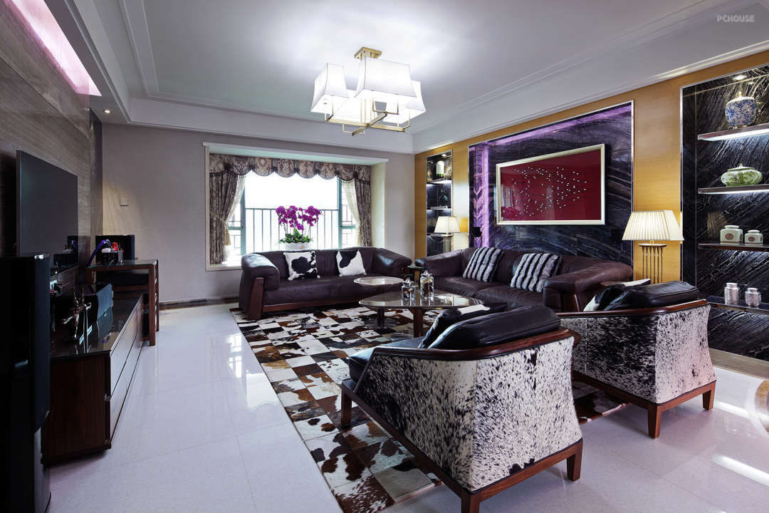 拼纹牛皮地毯,与沙发奶牛皮的抱枕,遥相呼应。