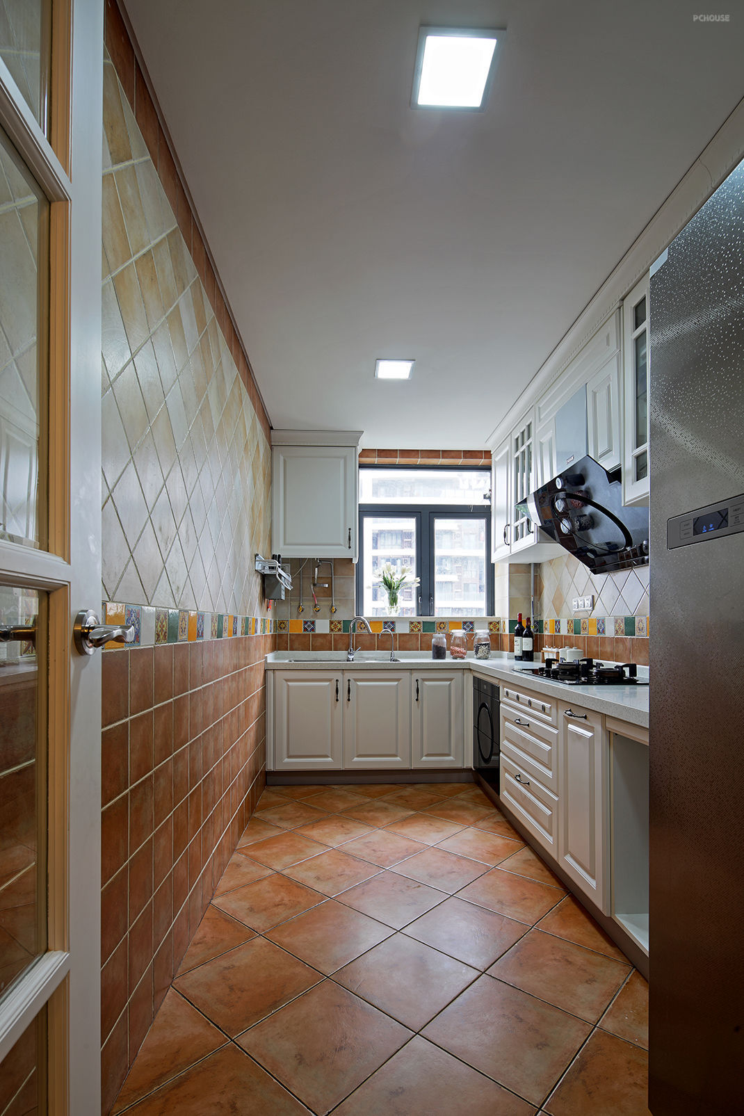 厨房多彩的腰线,配上暖色调的地砖,做饭不会再是单调的事情了。