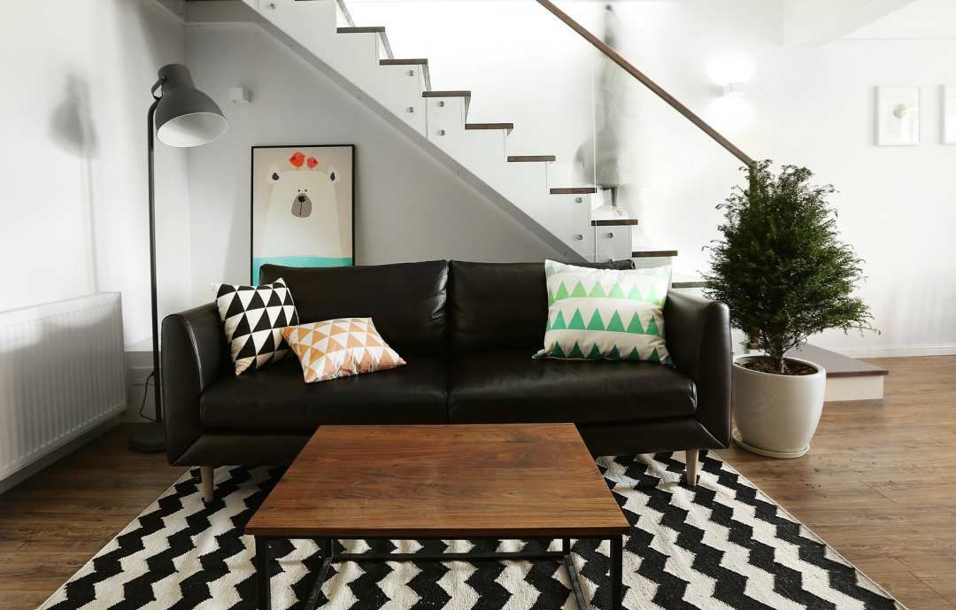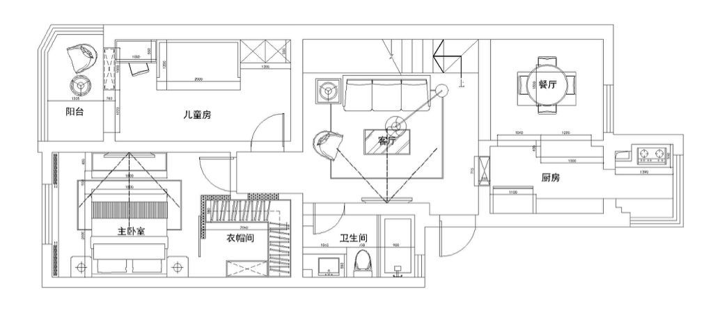 楼梯上去就有个采光很好的阳台,借助楼梯洞带给客厅采光,由于客厅空间比较小,为了让空间感觉更加宽敞,客厅的顶面就没有用主灯,而是选用了一个双头斗胆灯。