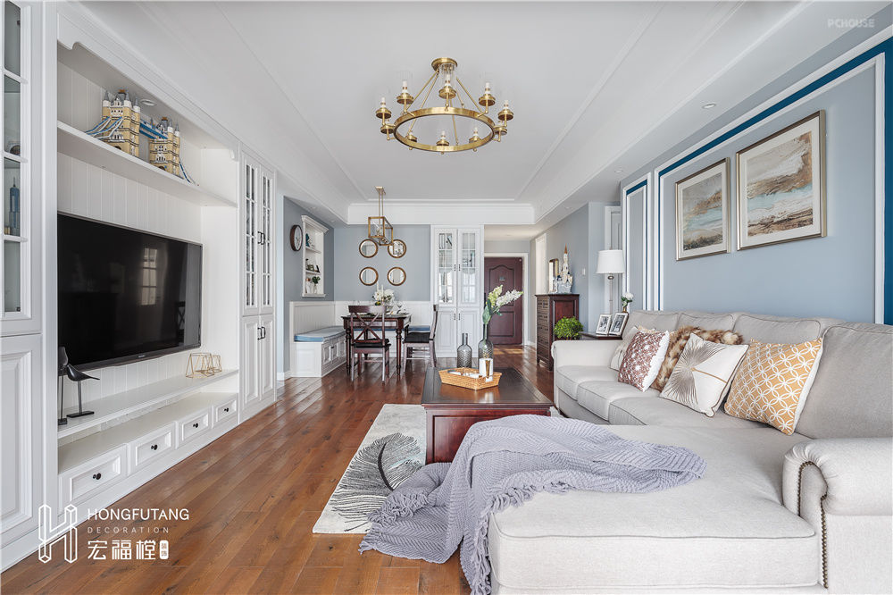 客厅空间面积较大,采用平吊顶视觉上会使得空间更高,吊顶线条细节处理使得空间更加精致;在色彩的搭配上,选用天青这样低明度色彩使得空间耐看,更有质感,也缓解了长期观影的疲劳;在电视墙的处理上,同样选用嵌入式,将电视墙整体作为一个收纳空间,电视放置中间位置作为开放式展示区,根据容纳物件尺寸设立分区,将摆件空间、中心位置、底柜空间按比例设置,扩大利用;两侧选用隔离收纳柜,可作为业主书籍摆放和收藏品收纳空间,采用上透明下封闭的样式,可以缓解满屏白色带来的空白感和木质收纳柜的呆板。