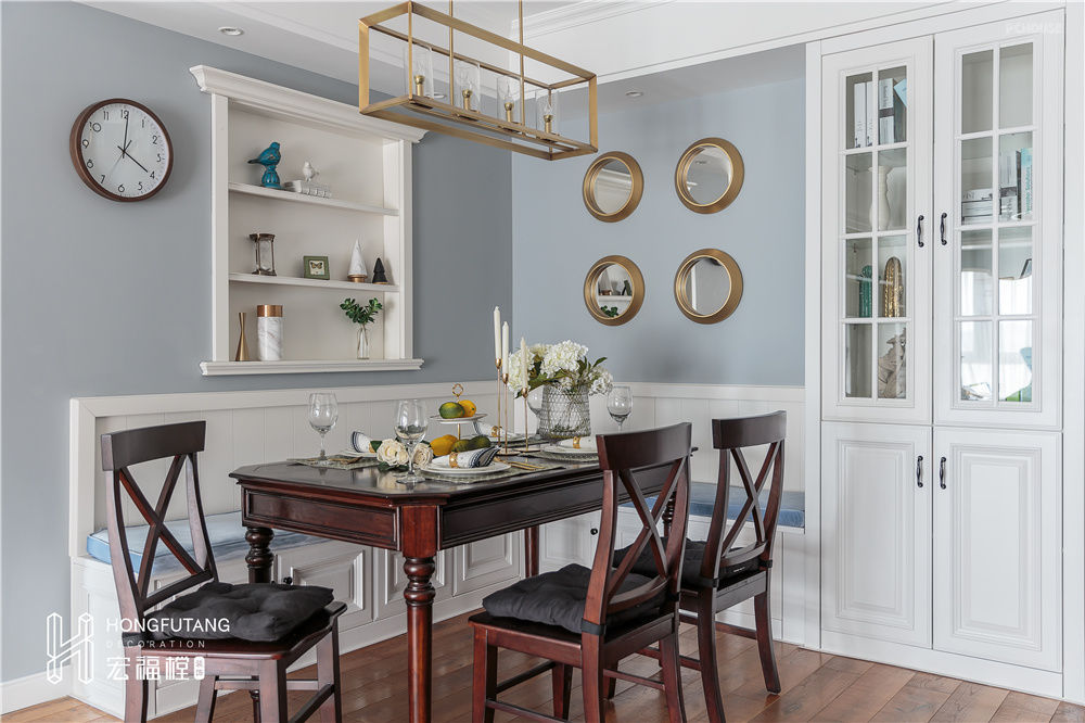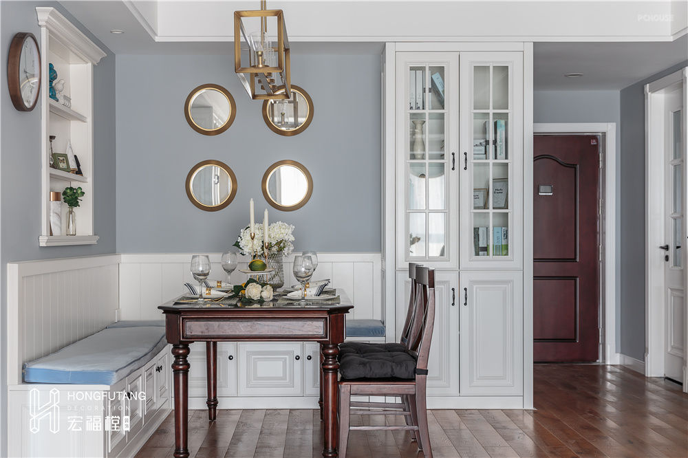 由于餐椅选用卡座形式,靠餐厅墙面剩余空间设立客厅同款收纳柜,将餐厅空间最大化的运用;餐厅墙面设立嵌入式展示空间,可以摆放日常小摆件,在细节处体现美式的精致。