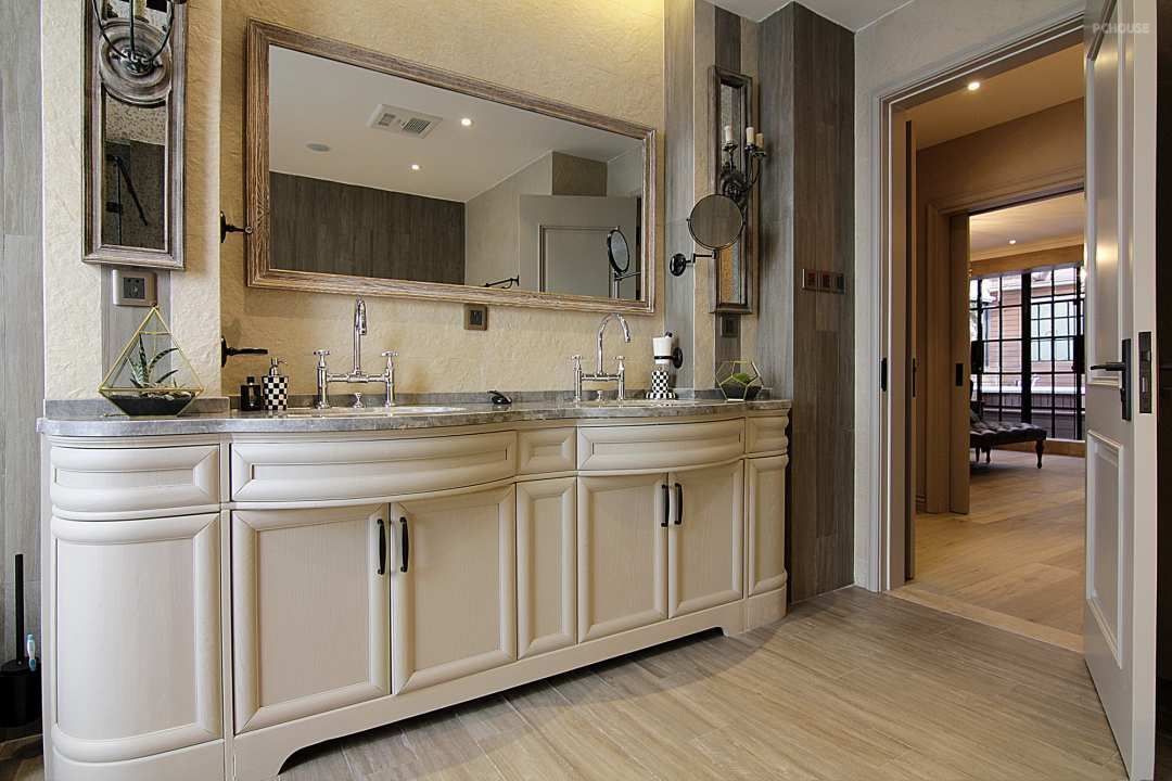 【原木镜框,裸色洗漱台面,经过处理的墙面纹理,使整个空间弥漫着自然建材的温润。】