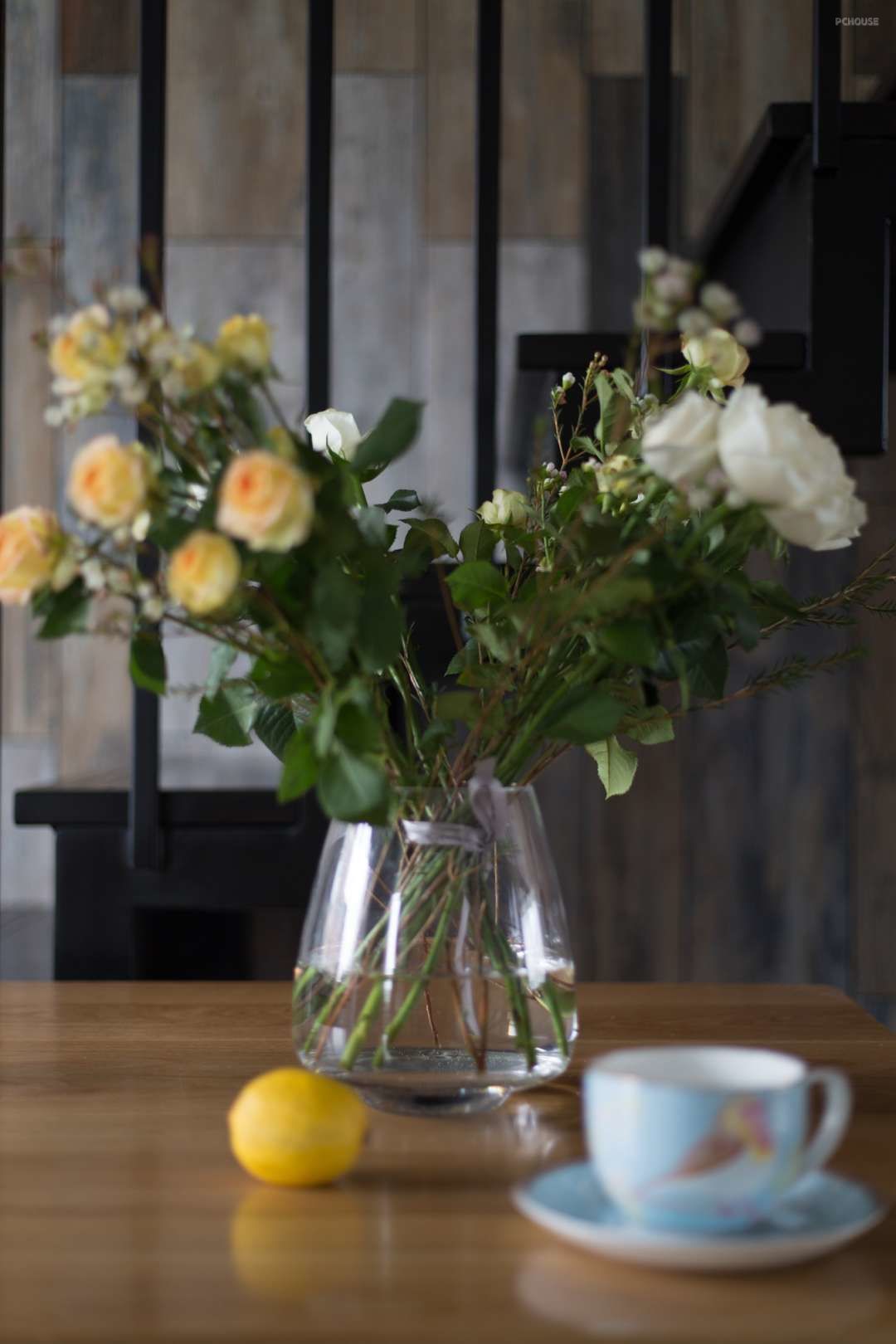 餐厅是挑高空间,楼梯也是从这里上去阁楼,本身餐厅空间加上北阳台属于狭长型空间,所以设计师把楼梯做成一字流线型且完全暴露出来,这样看起来把空间不至于太小,而且楼梯也成了一个很好的装饰。