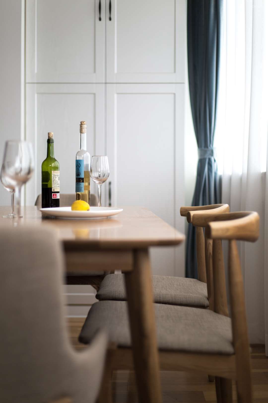 空间没有按照常规的方式去排列,大餐桌放在了阳台,只有人多的时候才会用到,平时俩人用餐厅的小餐桌就够了