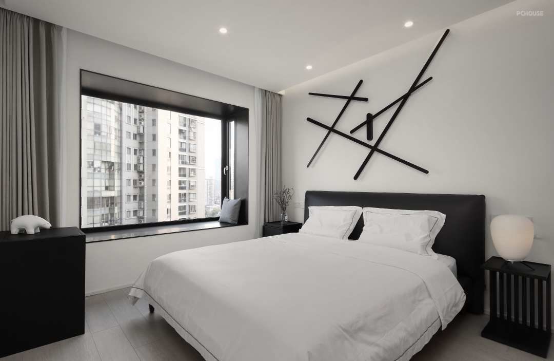 卧室墙面原先是斜的,重新做了木基层做了找平,床后面黑色的墙饰其实是一款壁灯.