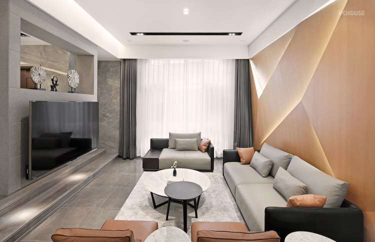 下沉式客厅,将空间的层次感提升。电视墙也是悬挂于顶部垂下,本案多出运用不规则造型,灯光的结合,让整体空间富有强烈设计感。